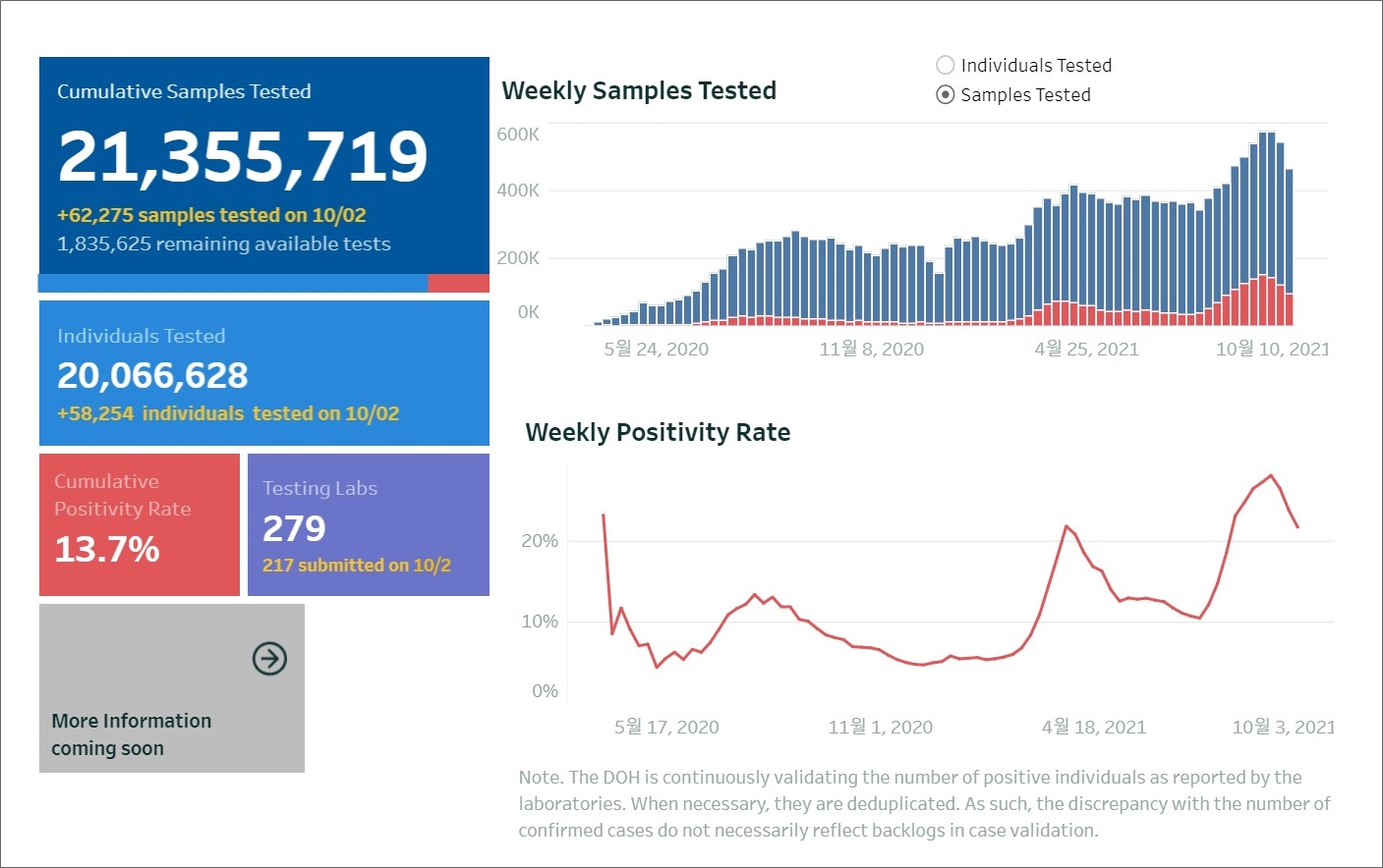 ※ 누적검사수(cumulative sample tested) : 21,290,983 (2021년 10월 1일 기준)