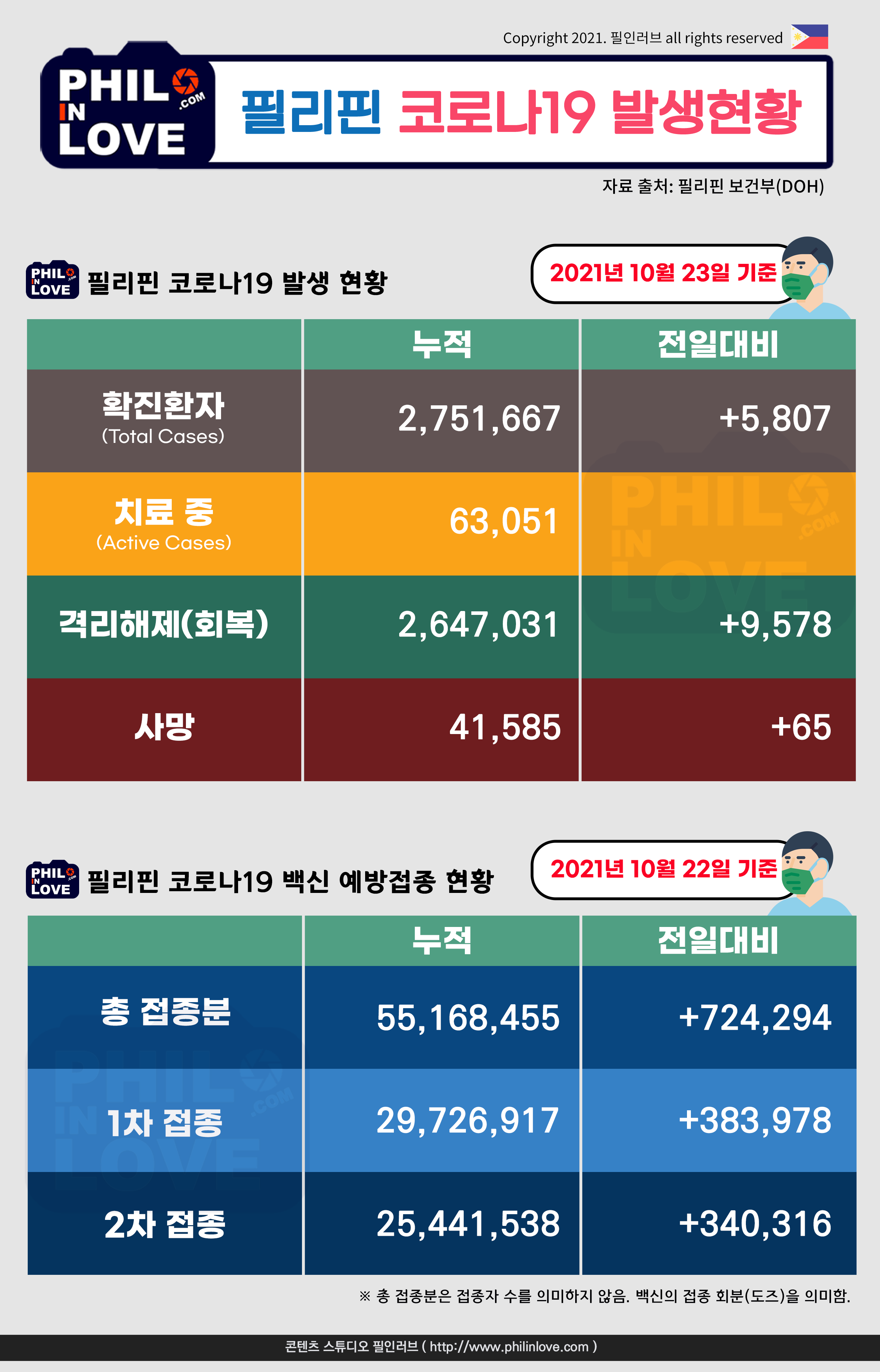 | 필리핀 코로나19 확진자 현황과 백신 예방접종 현황(2021년 10월 22일 현재) (0) | 2021.10.22 |
