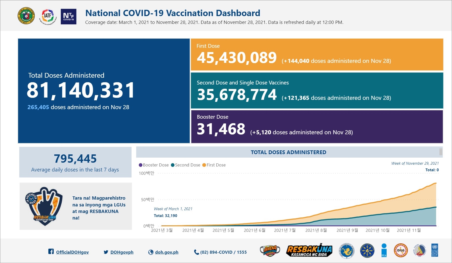 필리핀 코로나19 백신 예방접종 현황 (2021년 11월 28일 현재)