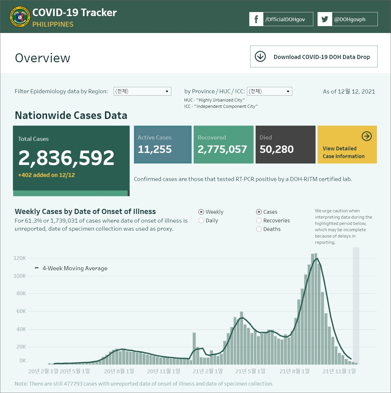 필리핀 코로나19 발생 현황 (2021년 12월 12일 현재)