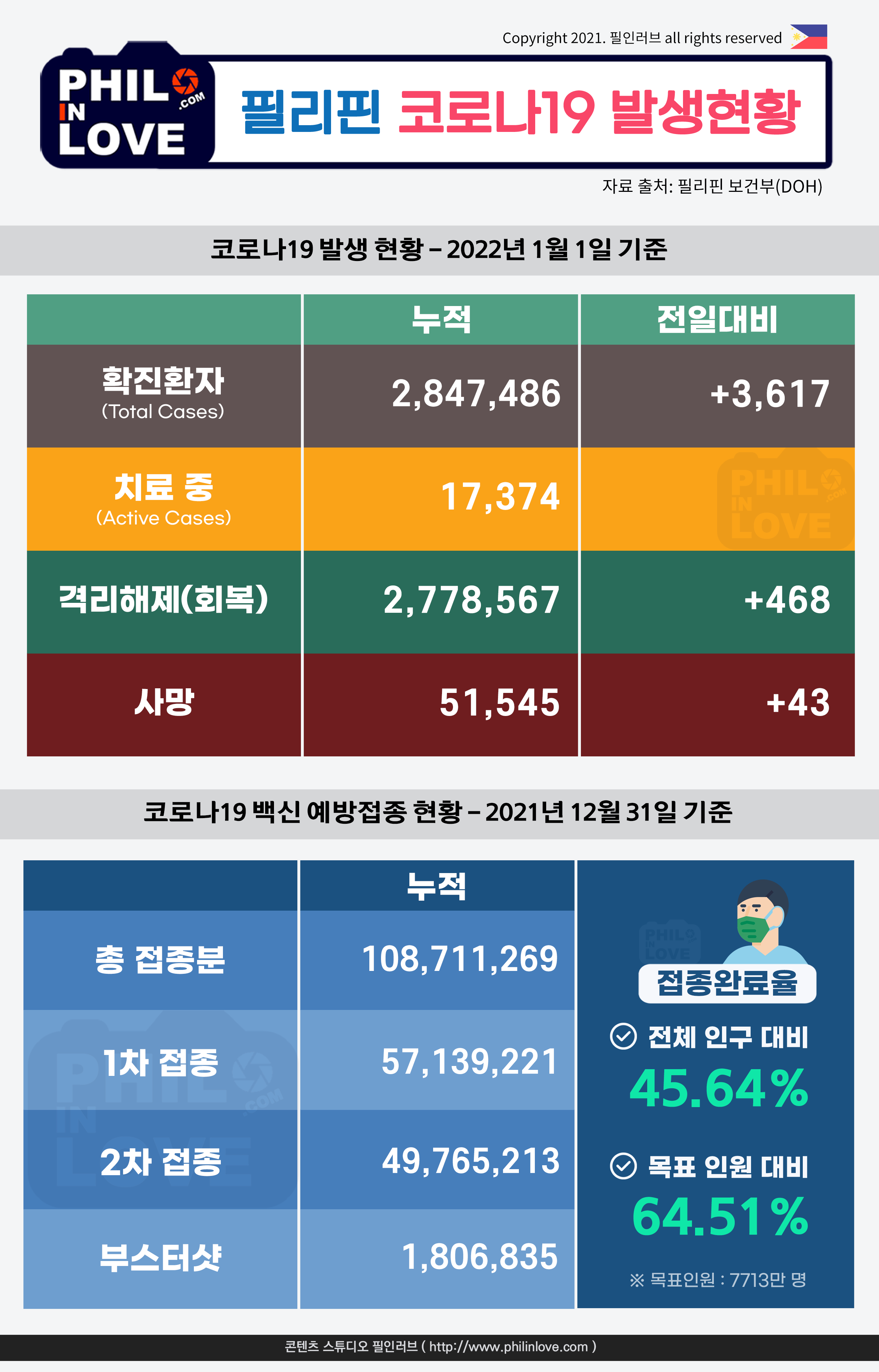 | 필리핀 코로나19 확진자 현황과 백신 예방접종 현황(2022년 1월 2일 현재) (0) | 2022.01.02 |