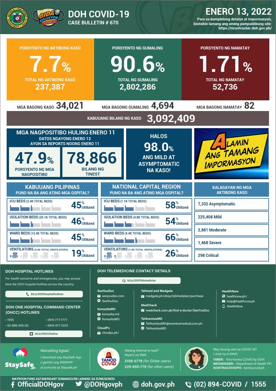 필리핀 코로나19 발생 현황 (2022년 1월 13일 현재)