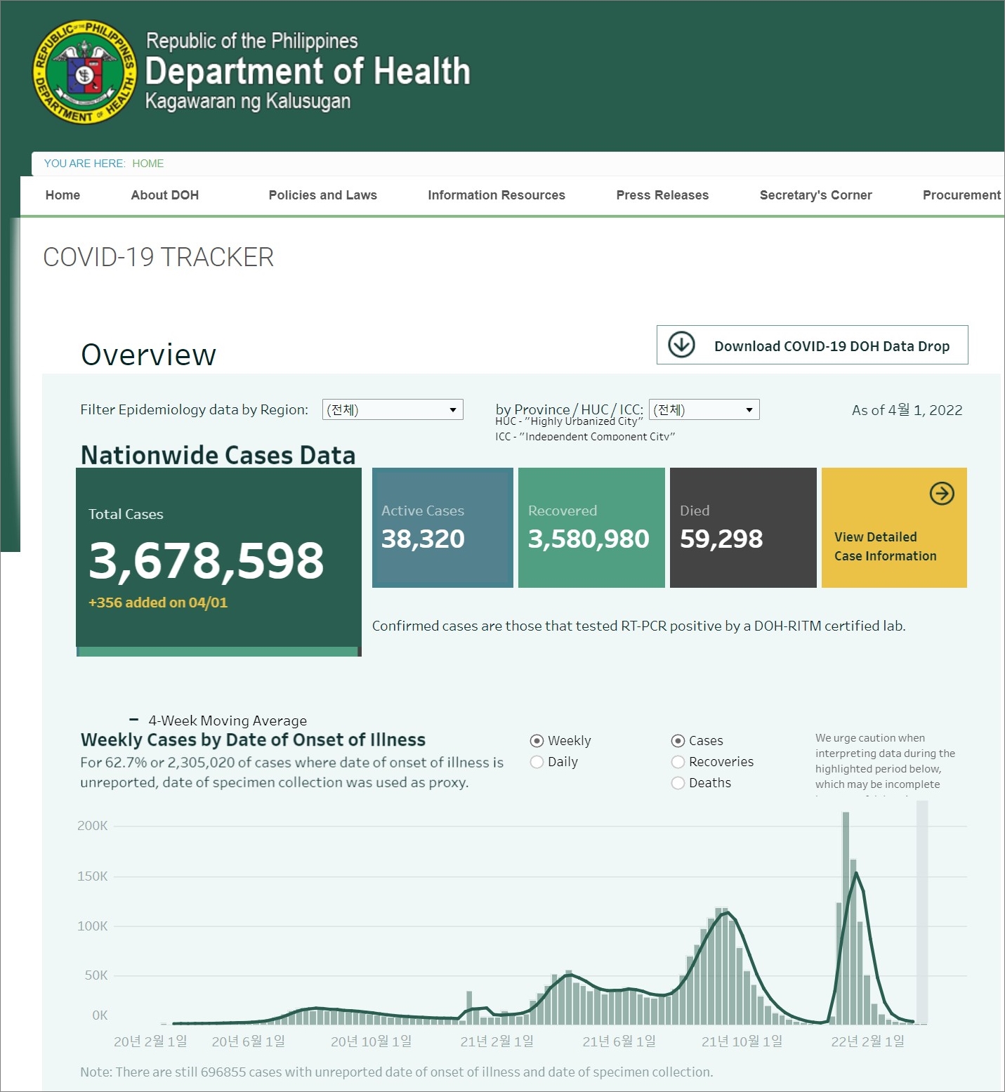 필리핀 코로나19 발생 현황 (2022년 4월 1일 현재)
