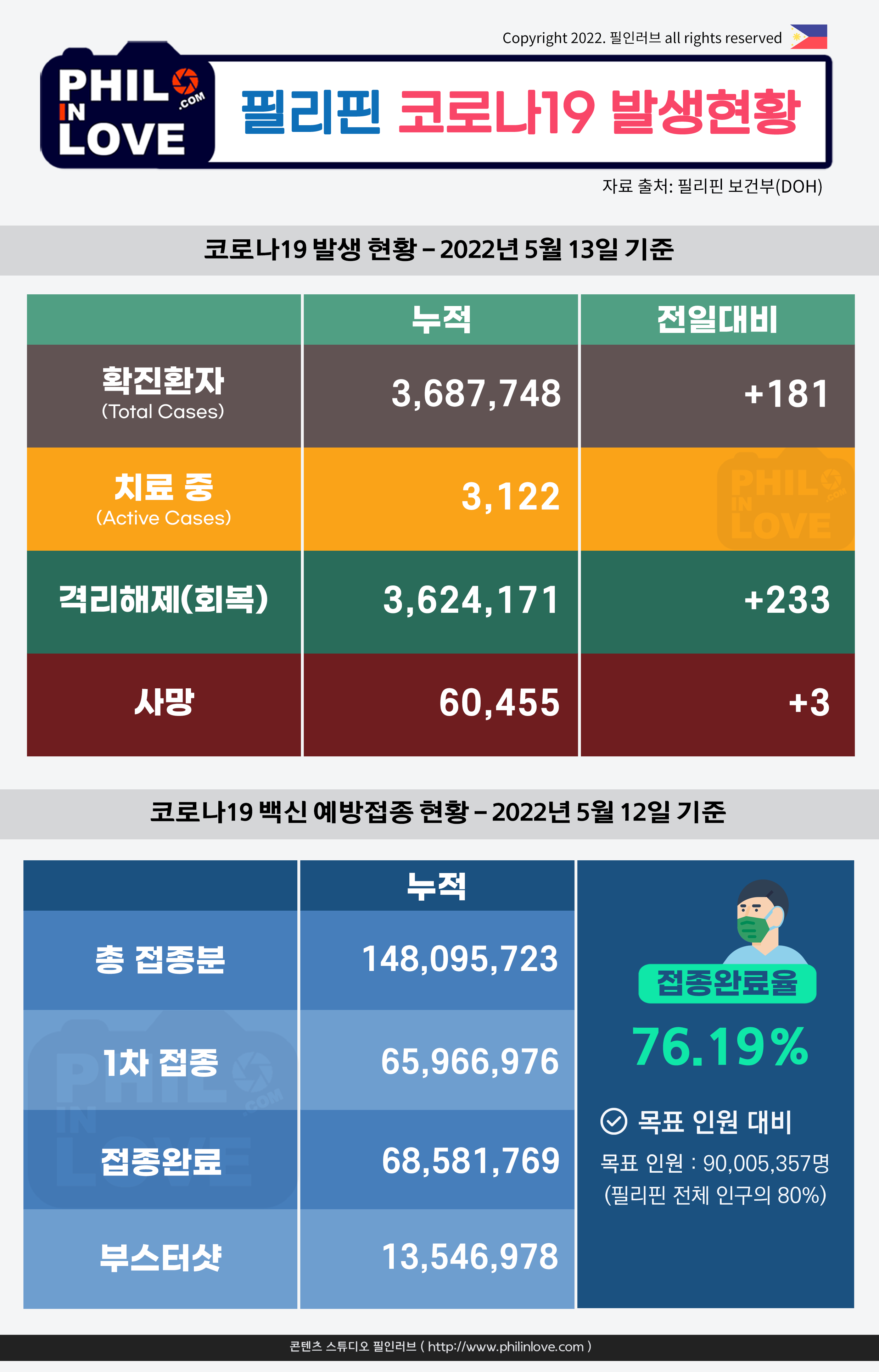 필리핀 코로나19 확진자 현황과 백신 예방접종 현황(2022년 5월 13일 현재)