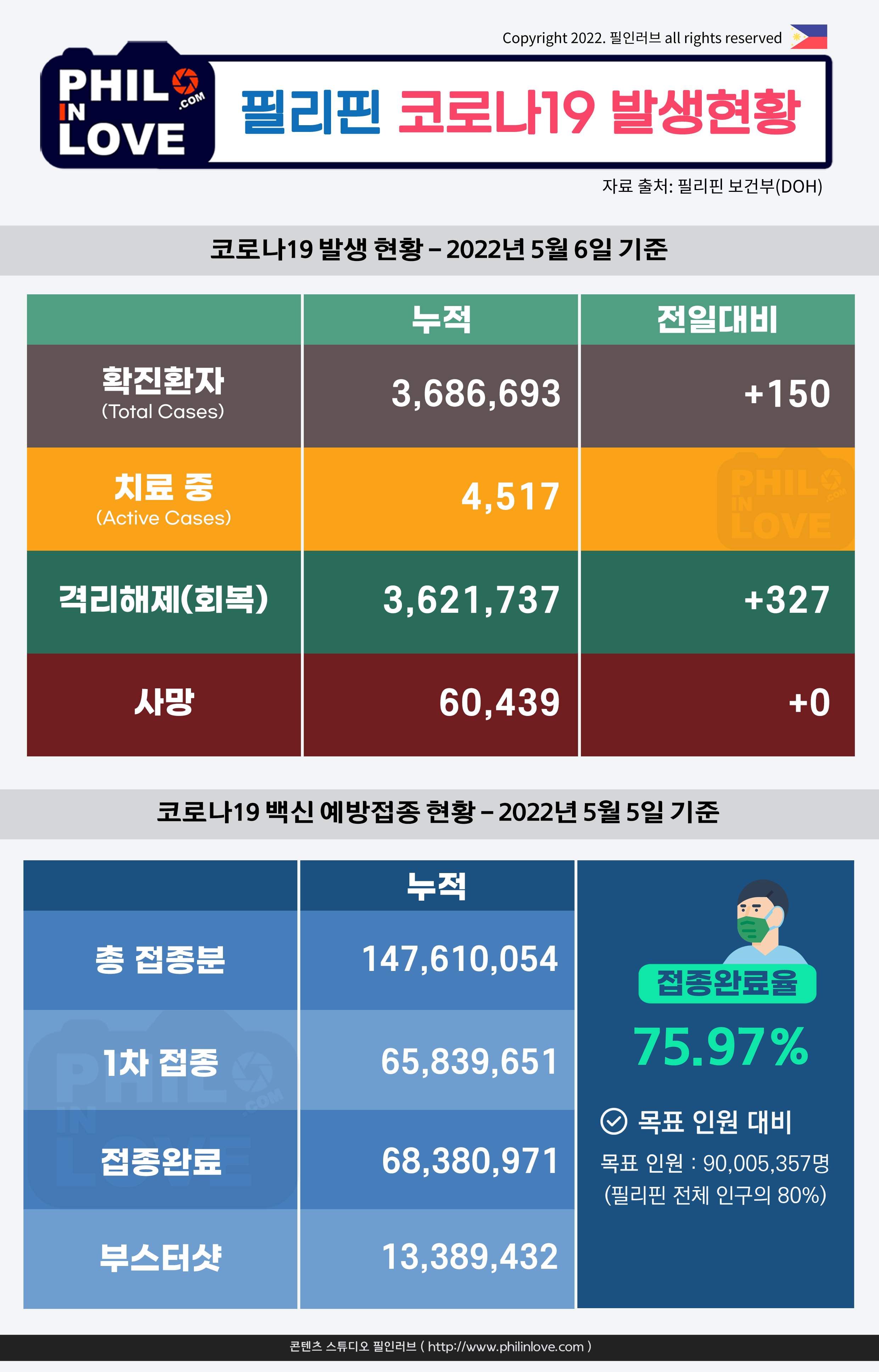 | 필리핀 코로나19 확진자 현황과 백신 예방접종 현황(2022년 5월 5일 현재) (0) | 2022.05.05 |