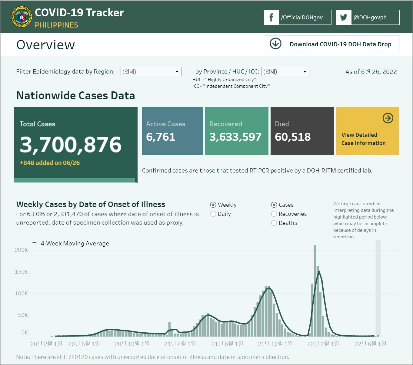 필리핀 코로나19 발생 현황 (2022년 6월 26일 현재)