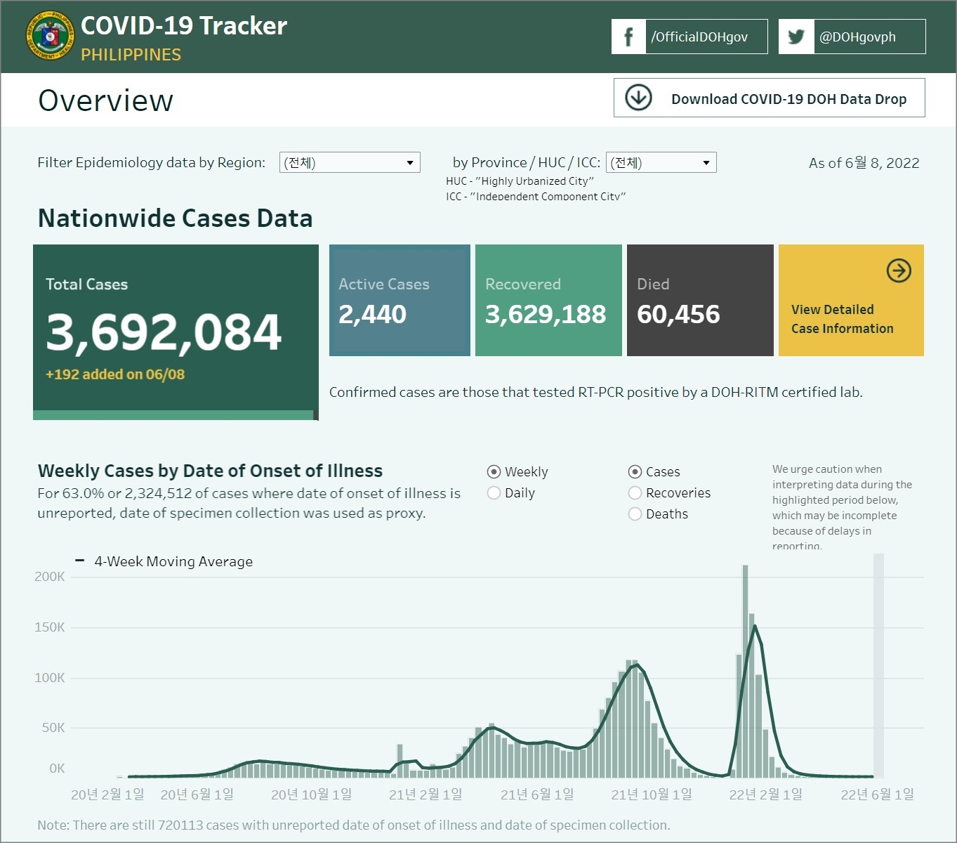 필리핀 코로나19 발생 현황 (2022년 6월 8일 현재)
