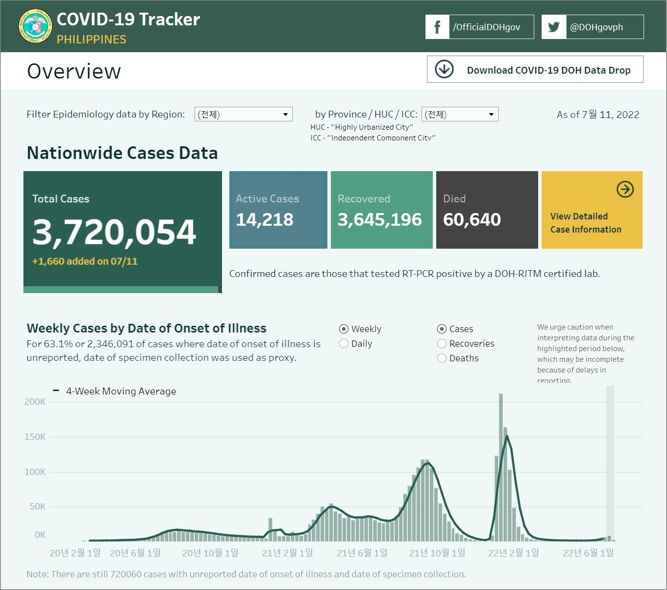 필리핀 코로나19 발생 현황 (2022년 7월 11일 현재)