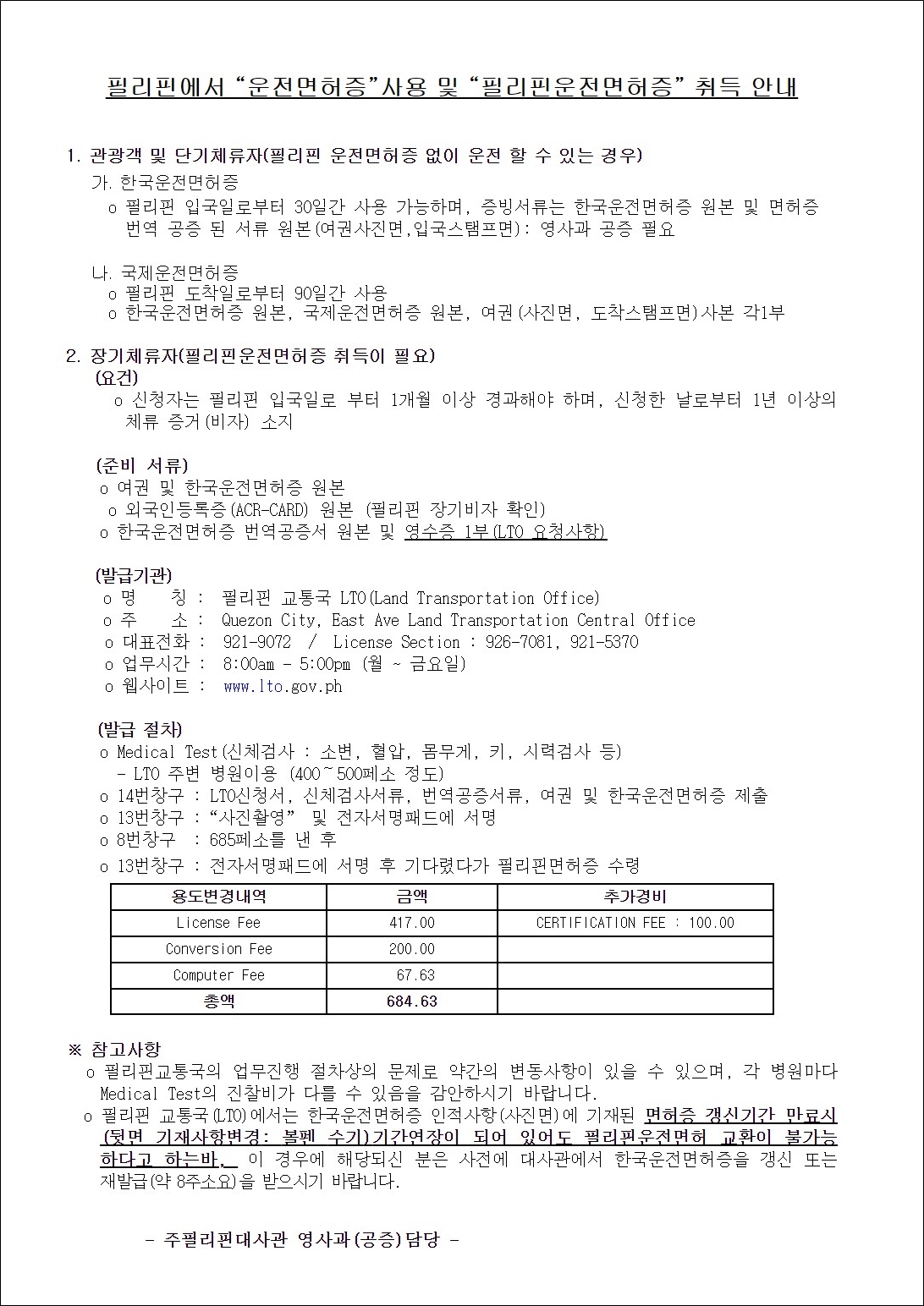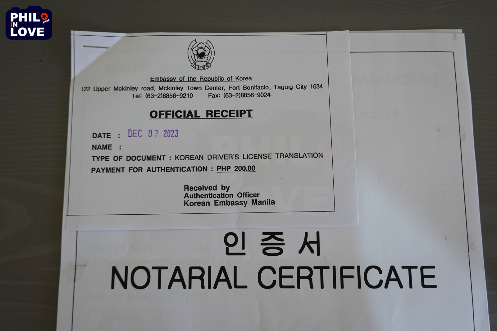 - 대사관에서 번역공증을 받은 운전면허증은 한국 운전면허증으로 필리핀 운전면허증을 취득할 때도 사용됨