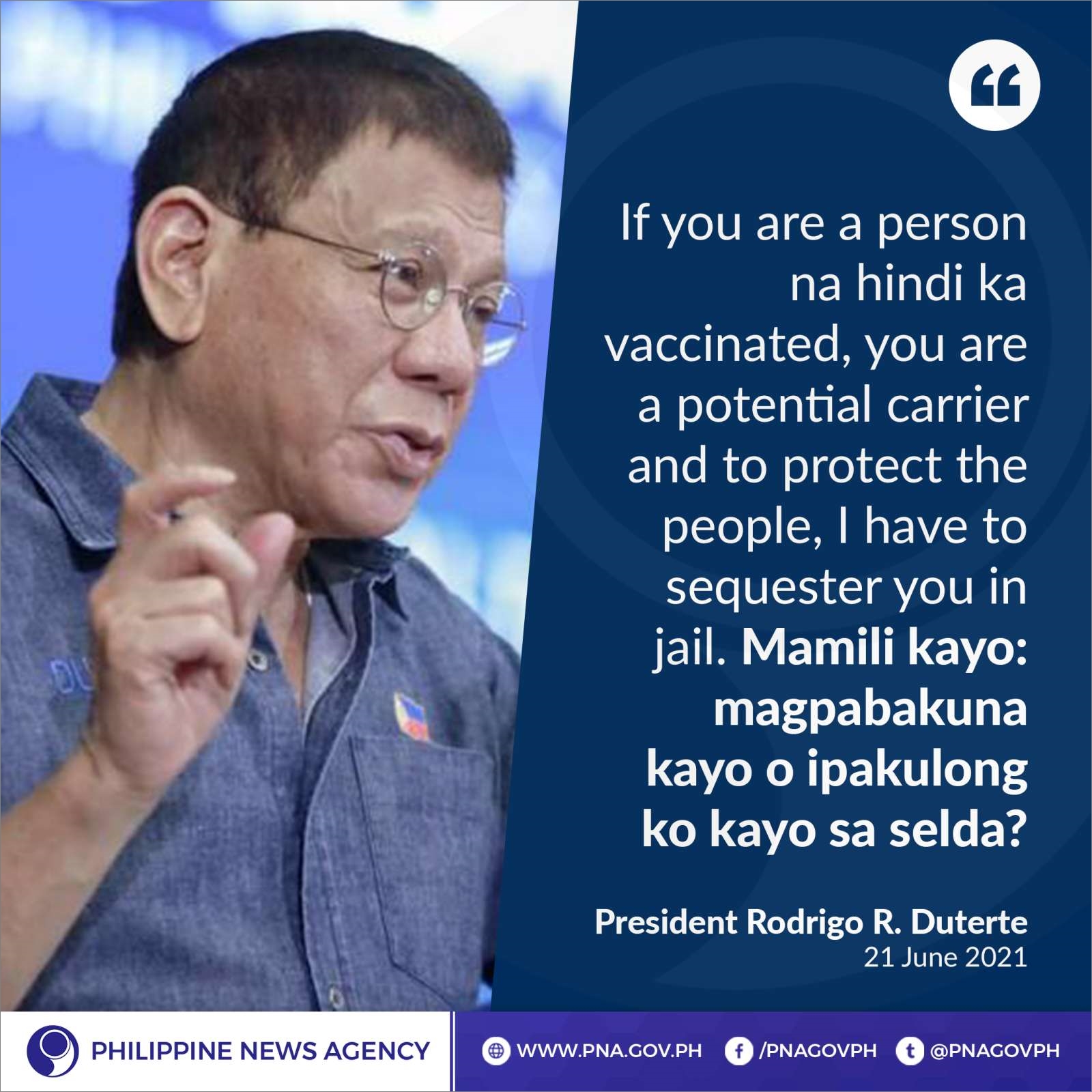 · Philippine News Agency : Leave PH, PRRD tells individuals who refuse to get vaccinated