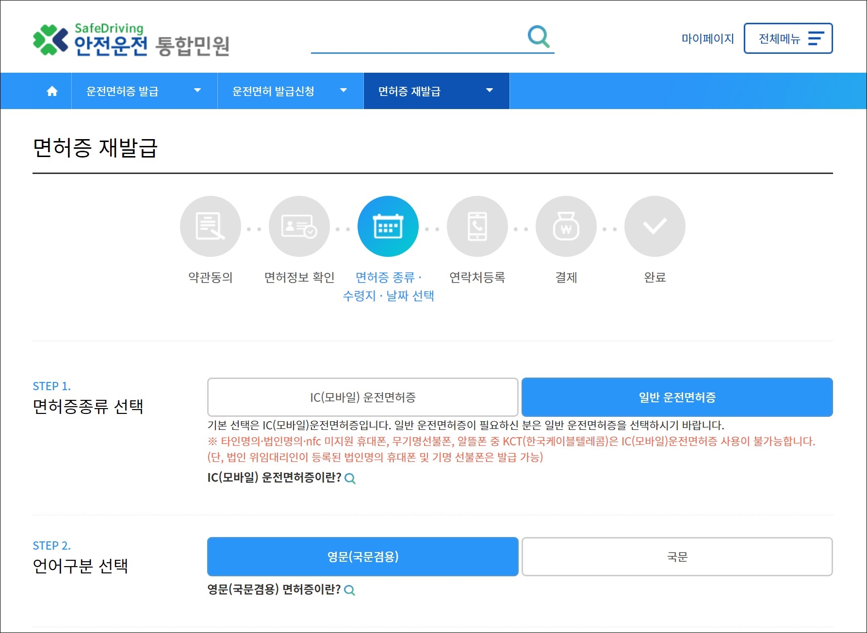 적성검사나 갱신 기간이 아니지만 영문 운전면허증을 신청하고자 하는 경우: 면허증 재발급으로 신청
