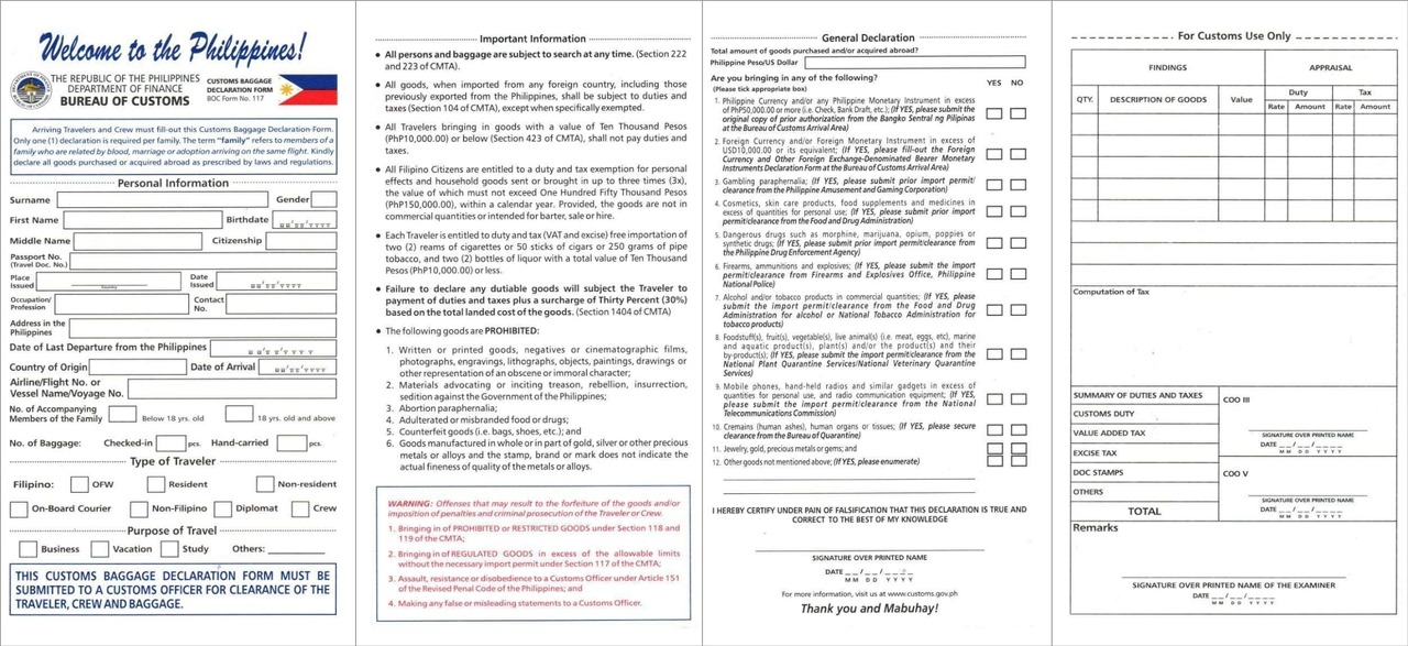 - All arriving passengers are required to accomplish a Customs Declaration from (BC Form 117) given on board the carrying aircraft.