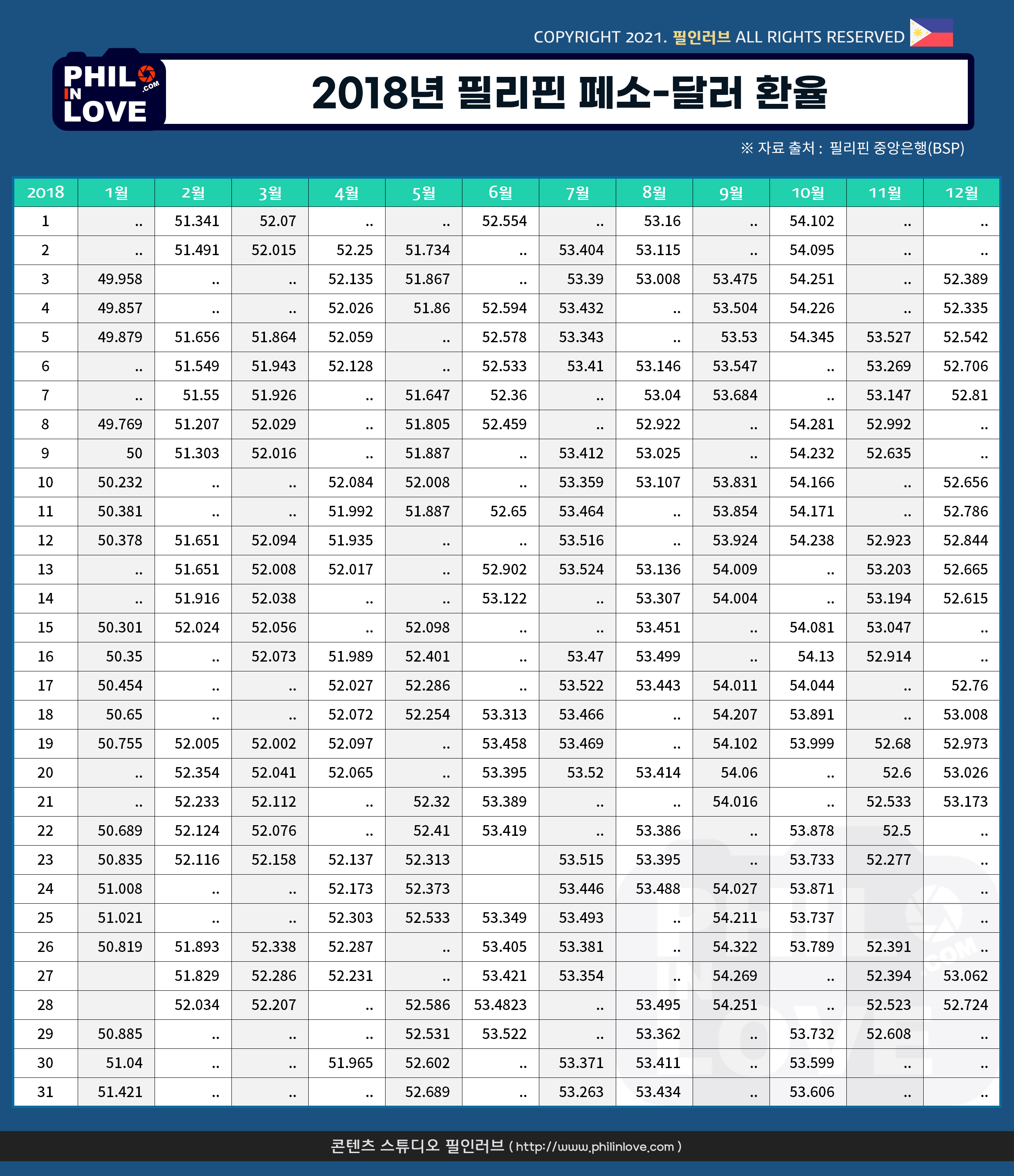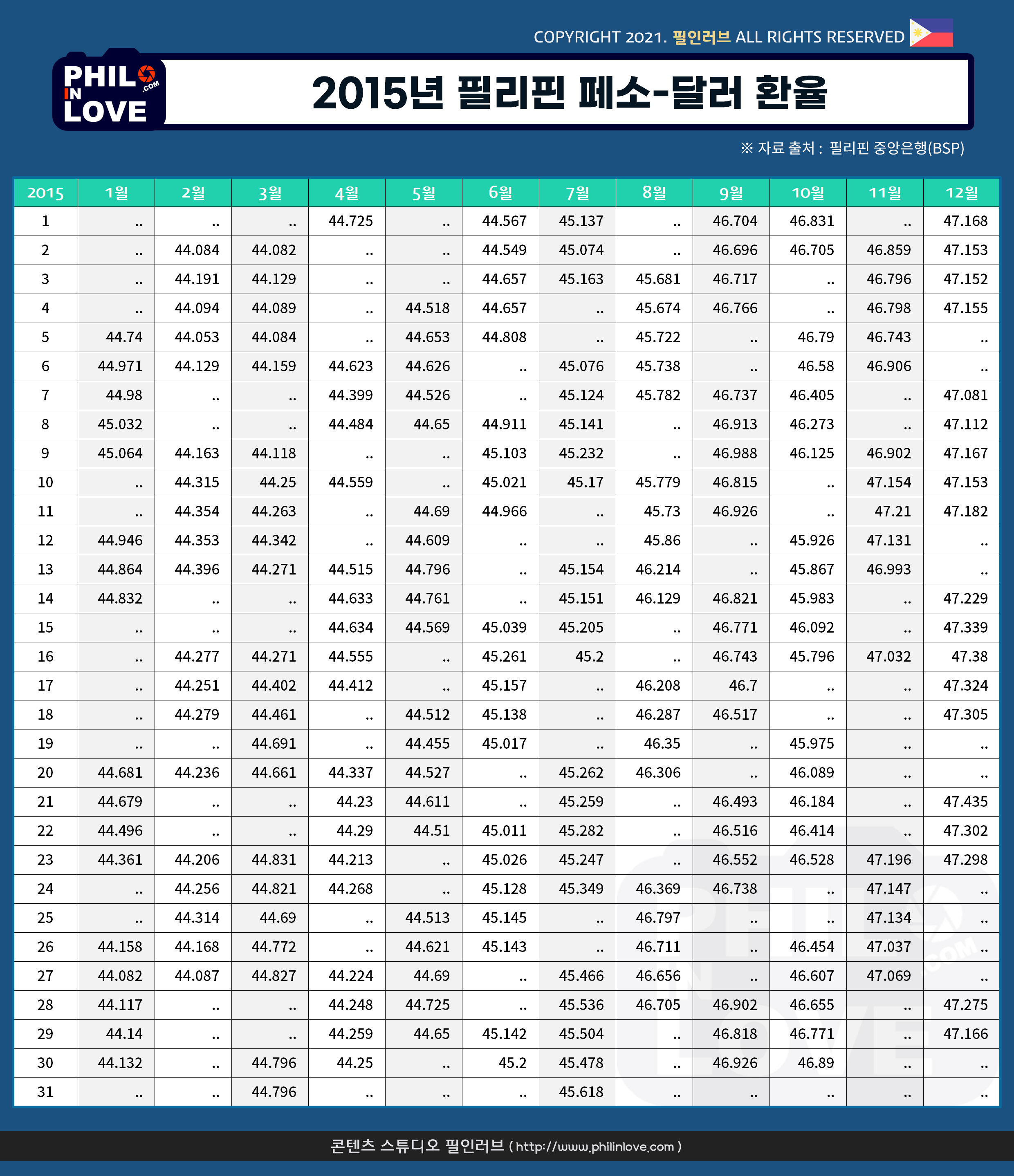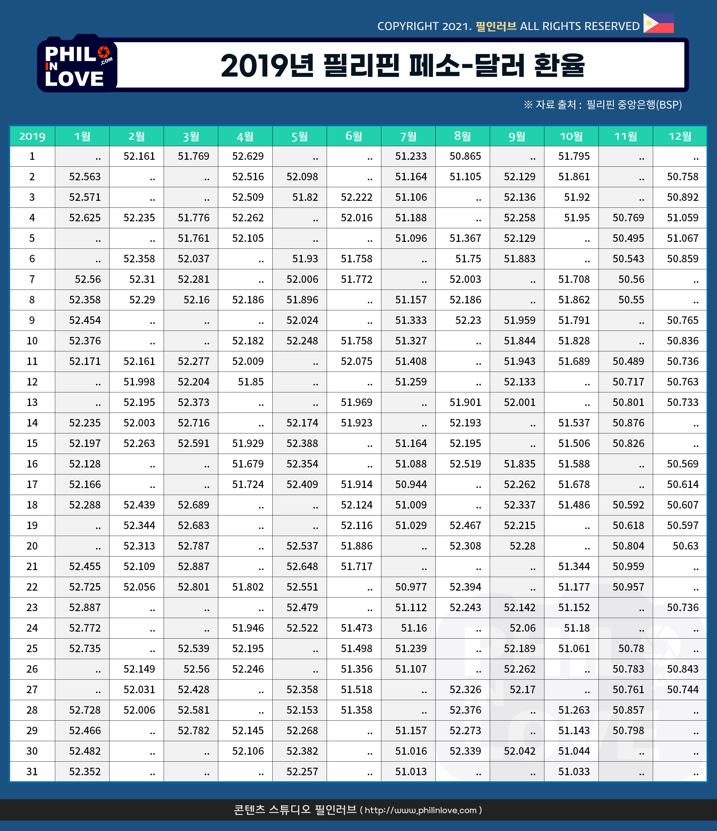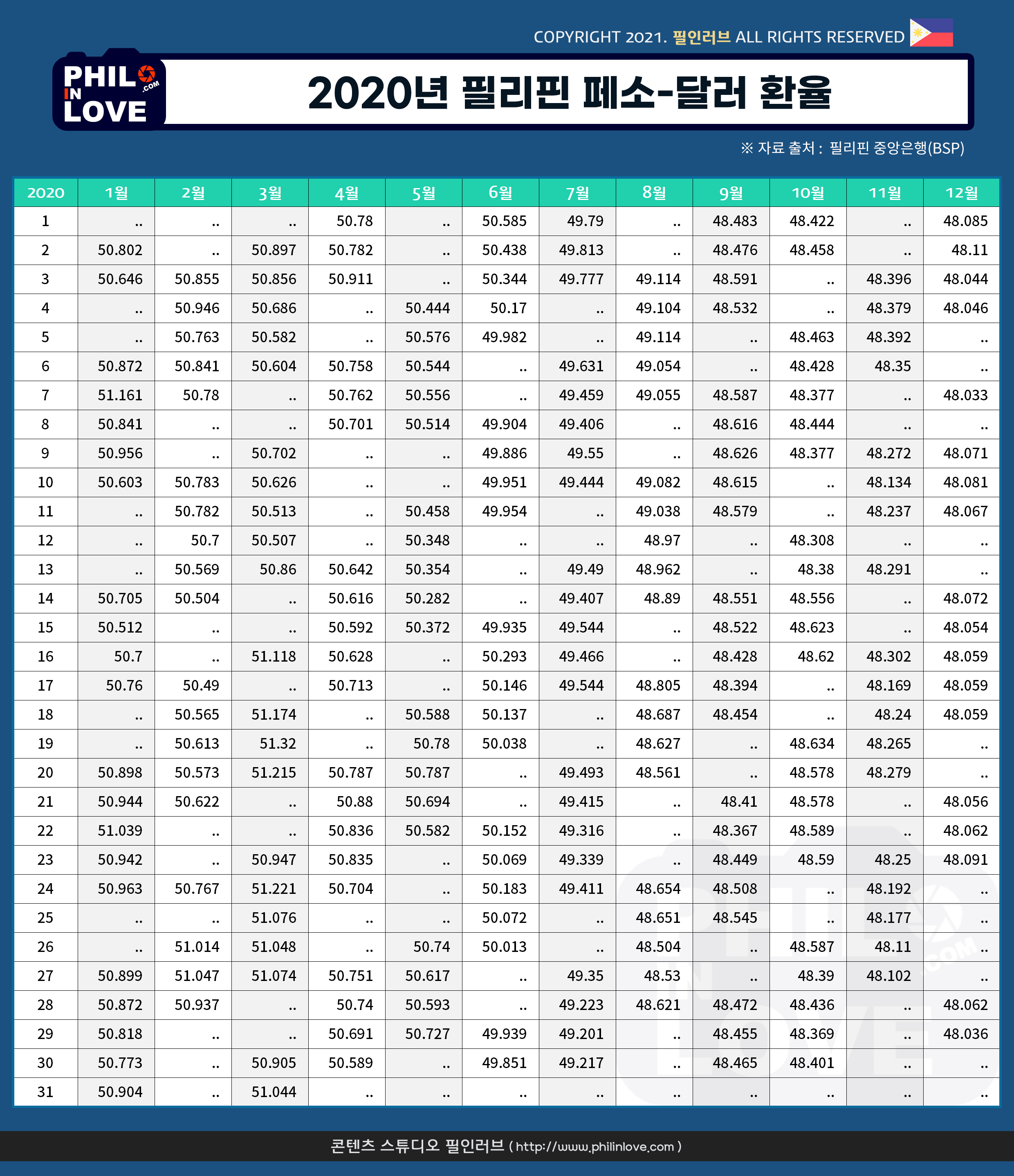 | [필리핀 환율] 페소화 강세 지속, 1달러 48.04페소 (0) | 2021.01.08 |