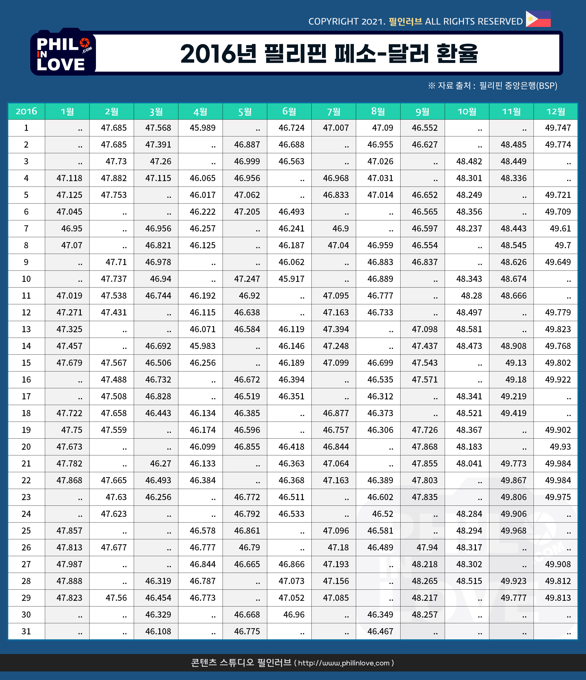 | [필리핀 환율] 페소화 강세 지속, 1달러 48.04페소 (0) | 2021.01.08 |