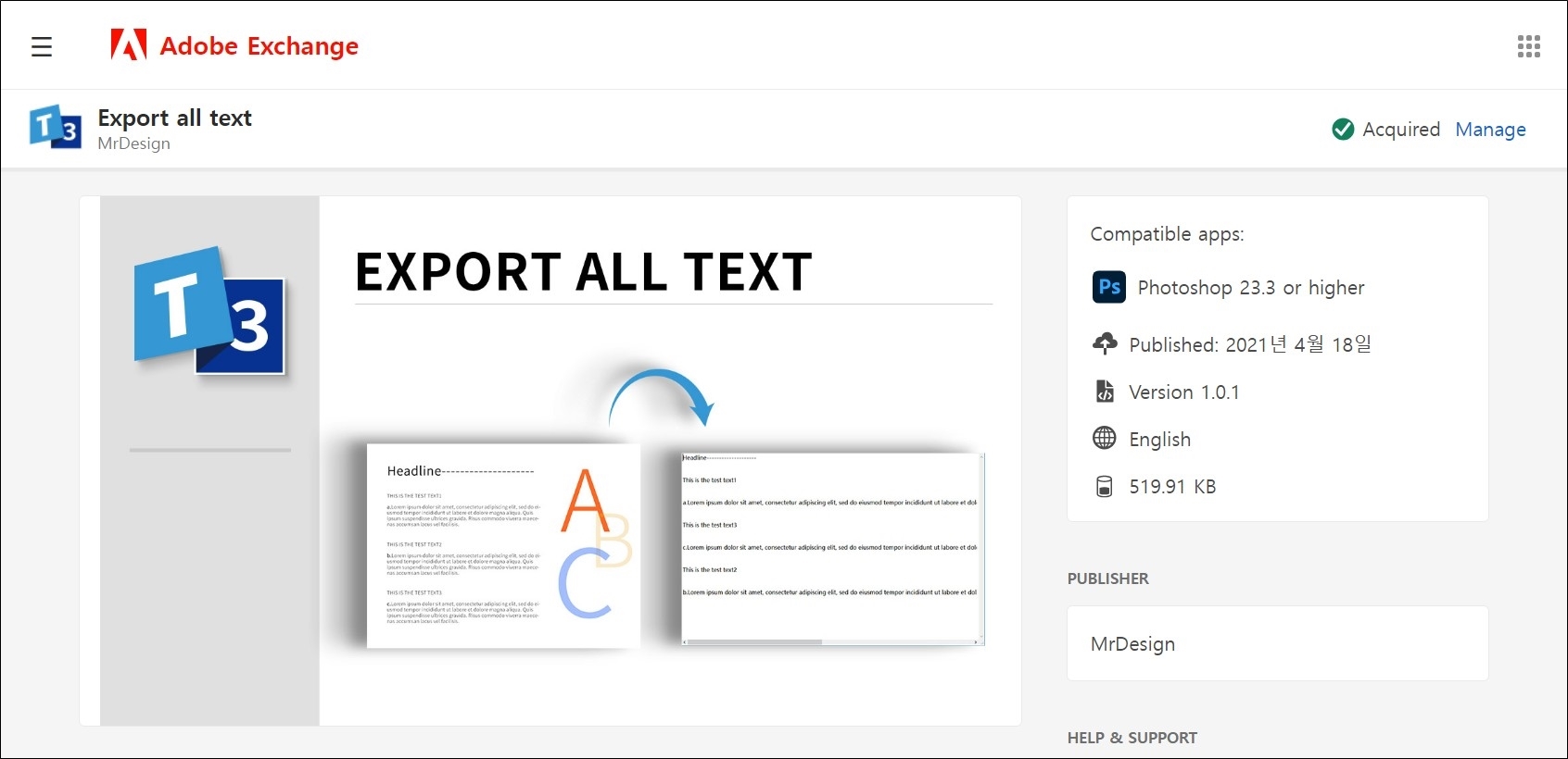 ① 어도비 익스체인지(Adobe Exchange)에서 Export all text 플러그인 다운로드 및 설치