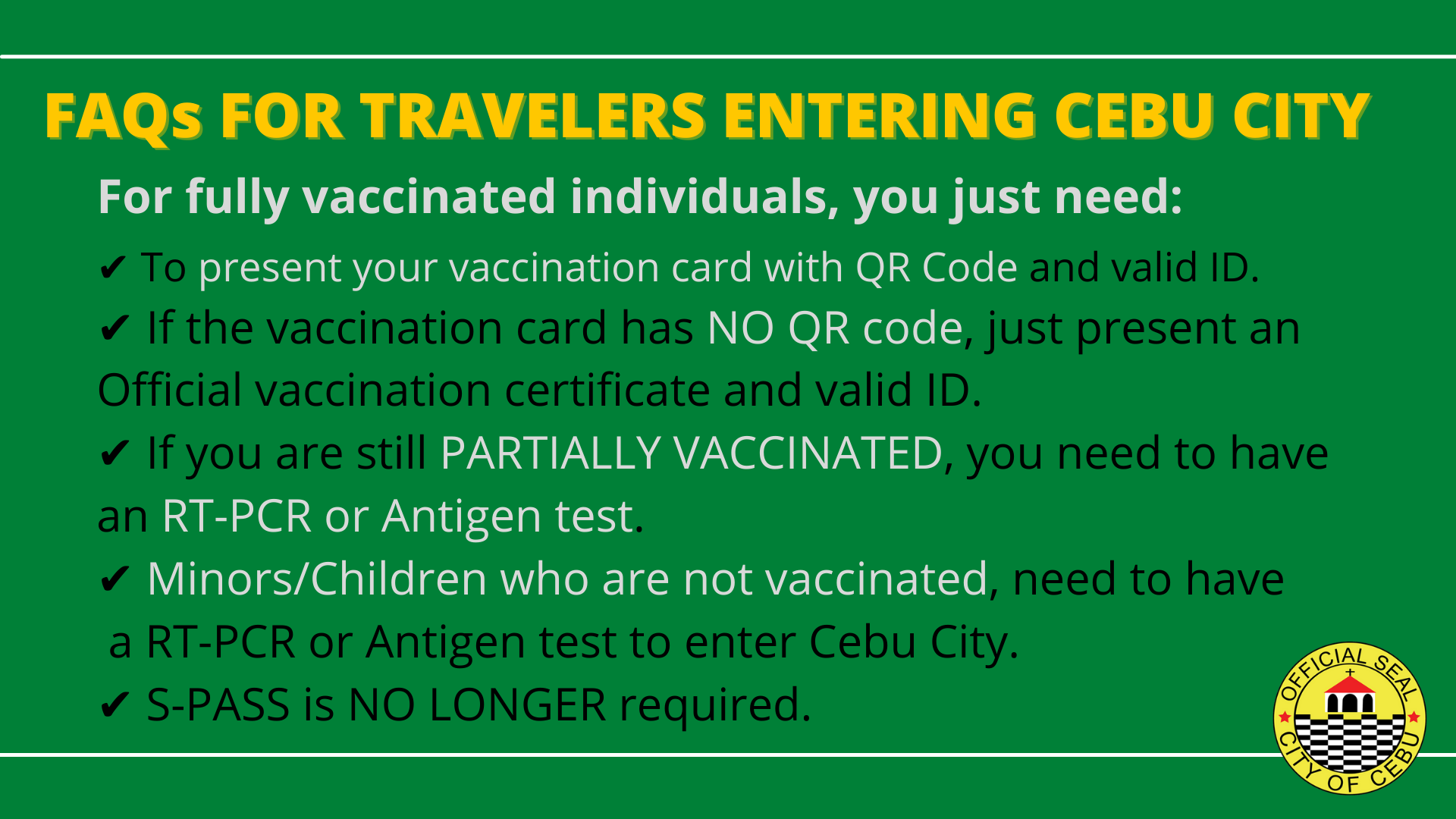 세부 시티(Cebu City)의 방역단계가 경고단계 2단계(Alert Level 2)가 됨에 따라 세부시티에서는 몇 가지 규정을 변경했는데, 그중 하나가 바로 예방접종완료자에 대한 코로나19 RT-PCR 음성확인서 제출 면제이다. 백신 접종 사실은 디지털 예방접종 증명서(VaxCertPH) 등을 통해 증명해야 하며, 만약 QR코드를 제시할 수 없다면 지역 보건소나 필리핀 보건부에서 발급한 백신접종증명서를 제시해야 한다. 더욱더 반가운 것은 S-PASS를 통해 여행허가서(TCP)나 경유허가서(TPP) 등을 발급받을 필요가 없어진다는 점이다. 하지만 아직 백신접종을 하지 않았거나 2회 접종이 필요한 백신을 1차 접종만 한 경우에는 여전히 코로나19 음성확인서를 제출해야 한다.