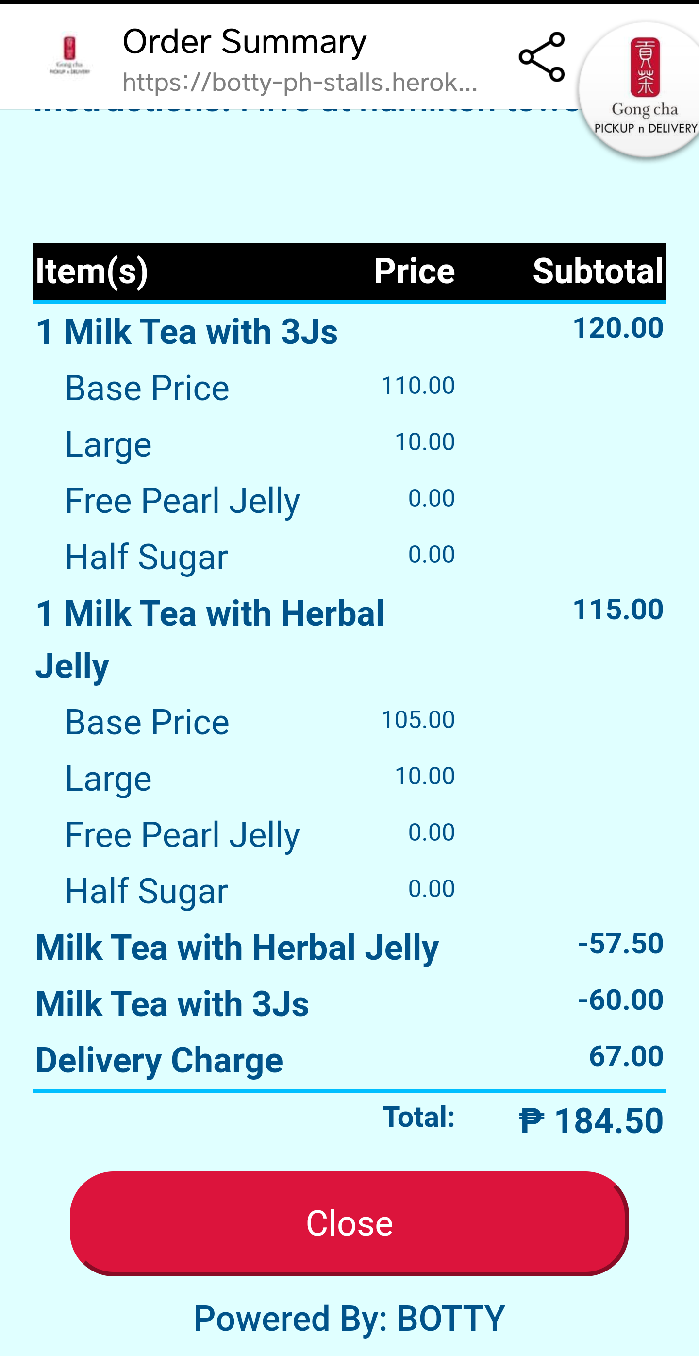 이래저래 계산기를 두들겨보고 음료수를 두 잔 살 경우라면 배달료를 내도 매장 픽업보다 배달이 더 저렴하다는 결론에 도달했다. 밀크티 두 잔을 그냥 사면 235페소인데, 할인을 받으면 배달료 67페소를 내도 결제 가격이 184페소가 되는 것이다. 필리핀 사람만큼이나 더하기 빼기에 약한 터라 이런 계산에 도달할 때까지 상당한 시간을 허비한 나는 바로 옆 건물에서의 배달을 선택하기로 했다.