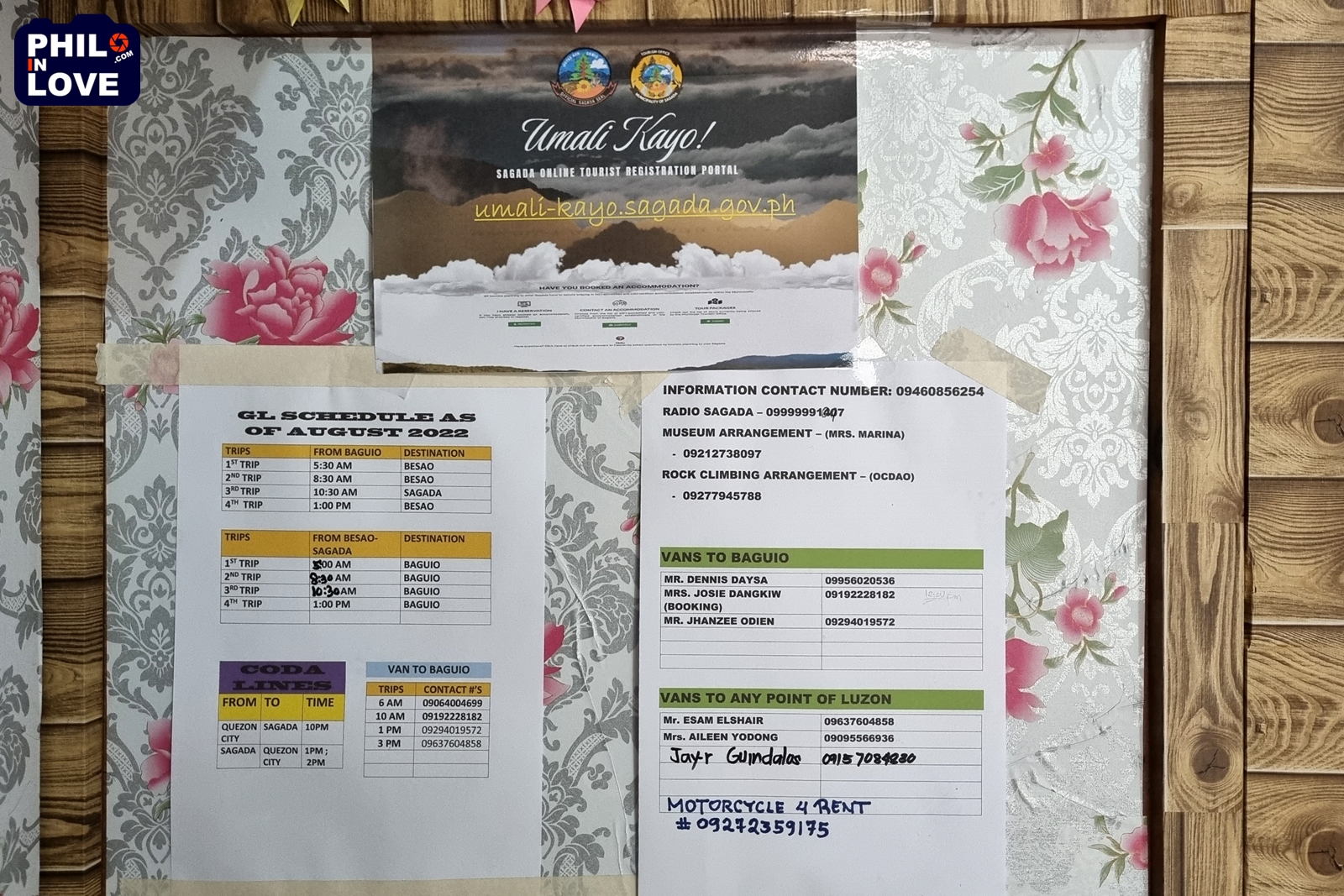 사가다(Sagada)를 여행하는 방법은 크게 두 가지로 나뉜다. 여행사에서 운영하는 투어프로그램을 이용하거나 버스를 타고 사가다로 가서 자유여행을 즐기는 방법이다. 필리핀 현지인들을 대상으로 하는 여행사 투어패키지는 가격이 비싼 편은 아니지만 크게 추천하고 싶은 방법은 아니다. 비용 절감을 위해 최대한 많은 인원을 인솔하여 가기 때문이다. 버스가 아닌 승합차가 동원되기도 하는데, 여행객을 많이 태우기 위해 가지고 갈 수 있는 가방 개수를 제한하는 경우도 있다. 어떤 방법을 택하든 긴 시간 차를 타야 한다는 사실은 변함이 없다.