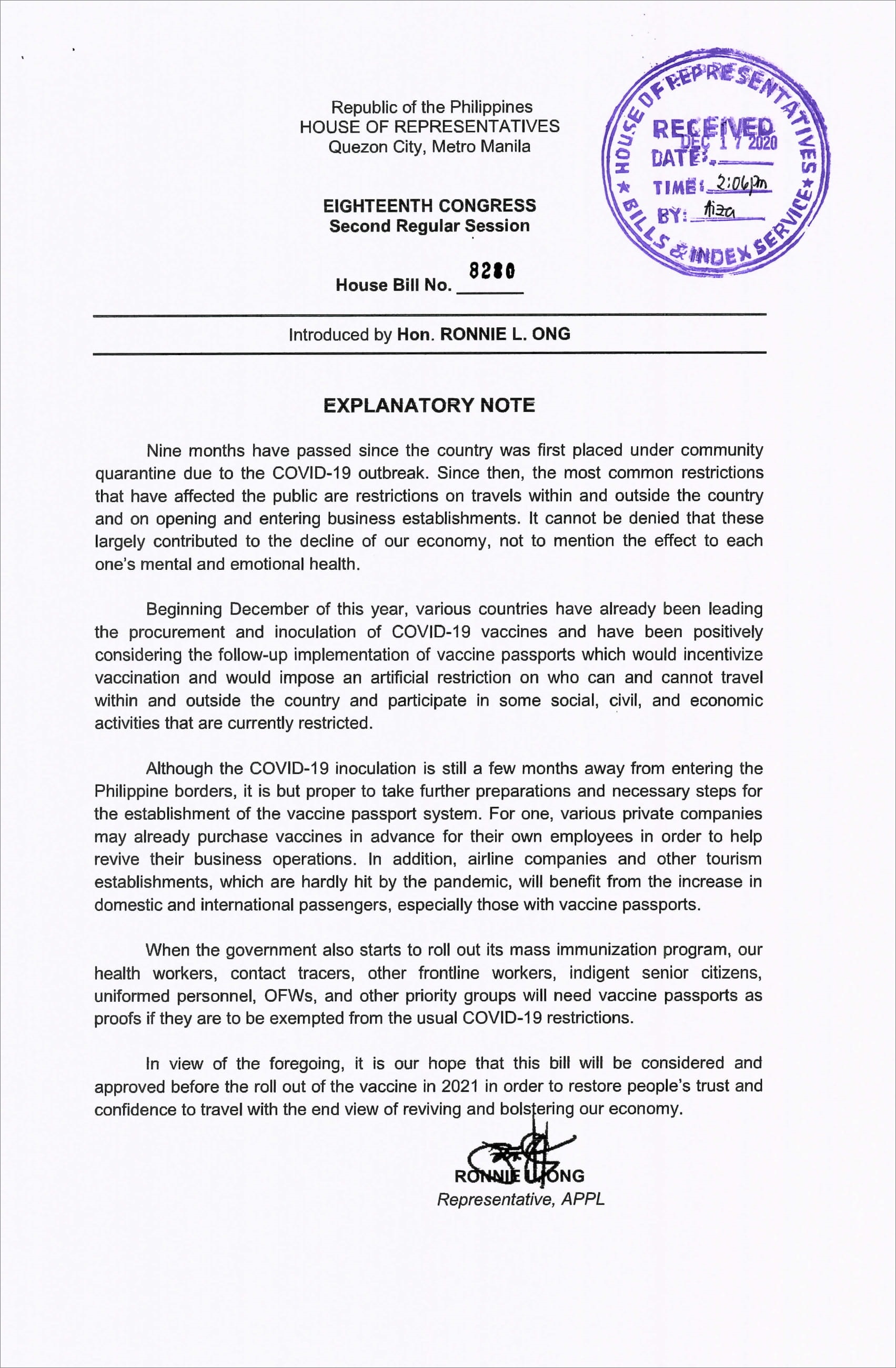 지난 2020년 12월 17일, 필리핀 하원에 백신접종서 관련 내용을 다룬 법안(House Bill 8280)이 제출되었다. Hon. Ong, Ronnie L. 하원의원이 An Act providing for a Vaccine or Immunization Passport for COVID-19 and Other Infectious Diseases라는 제목으로 제출한 이 법안에 따르면, 이름, 생년월일, 성별, 주소 등과 같은 개인정보를 바탕으로 백신 접종 날짜와 접종 기관, 백신 종류, 코로나19 감염 기록, 기저질환, 코로나 검사 결과 등의 정보가 담긴 백신접종증명서(백신여권)를 발급하여 아래의 경우 사용하게 된다.