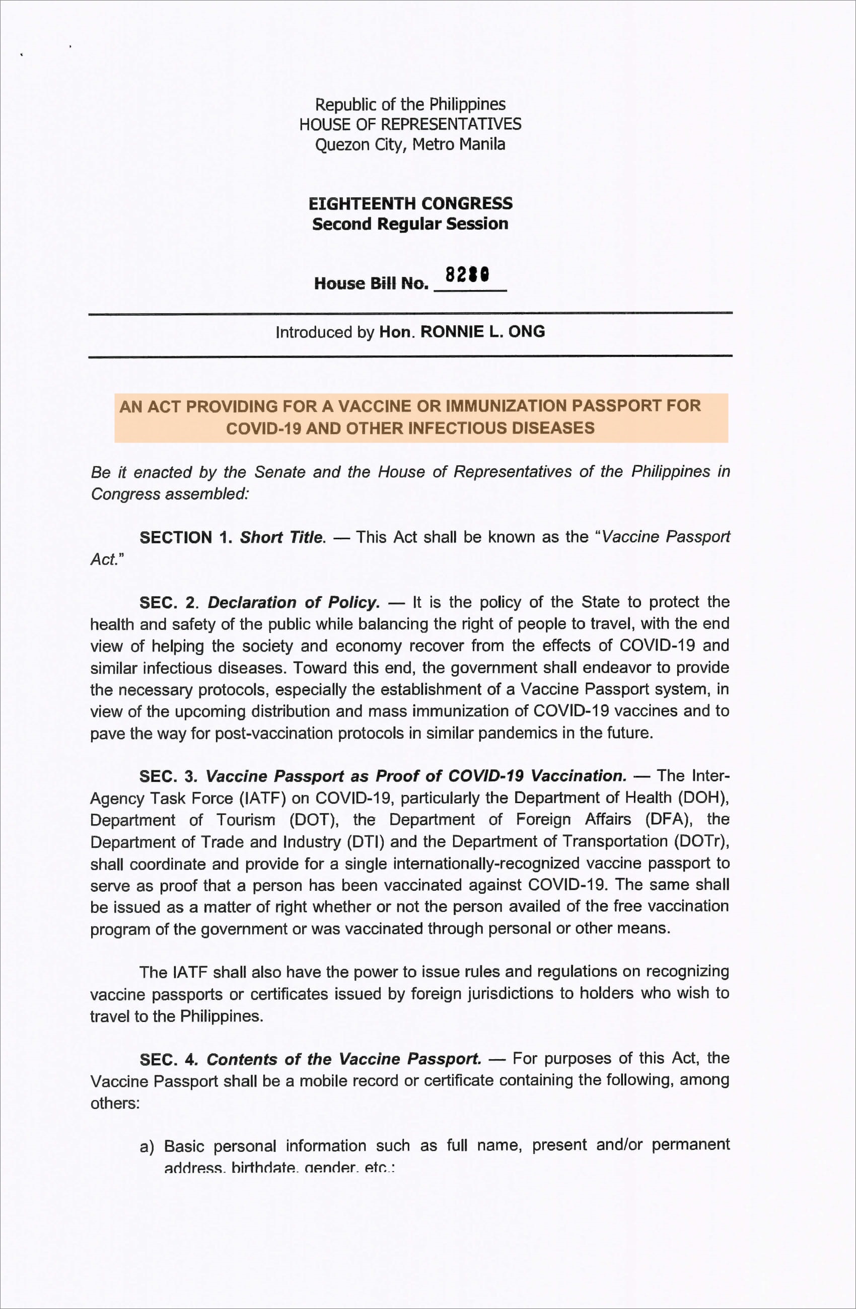 지난 2020년 12월 17일, 필리핀 하원에 백신접종서 관련 내용을 다룬 법안(House Bill 8280)이 제출되었다. Hon. Ong, Ronnie L. 하원의원이 An Act providing for a Vaccine or Immunization Passport for COVID-19 and Other Infectious Diseases라는 제목으로 제출한 이 법안에 따르면, 이름, 생년월일, 성별, 주소 등과 같은 개인정보를 바탕으로 백신 접종 날짜와 접종 기관, 백신 종류, 코로나19 감염 기록, 기저질환, 코로나 검사 결과 등의 정보가 담긴 백신접종증명서(백신여권)를 발급하여 아래의 경우 사용하게 된다.