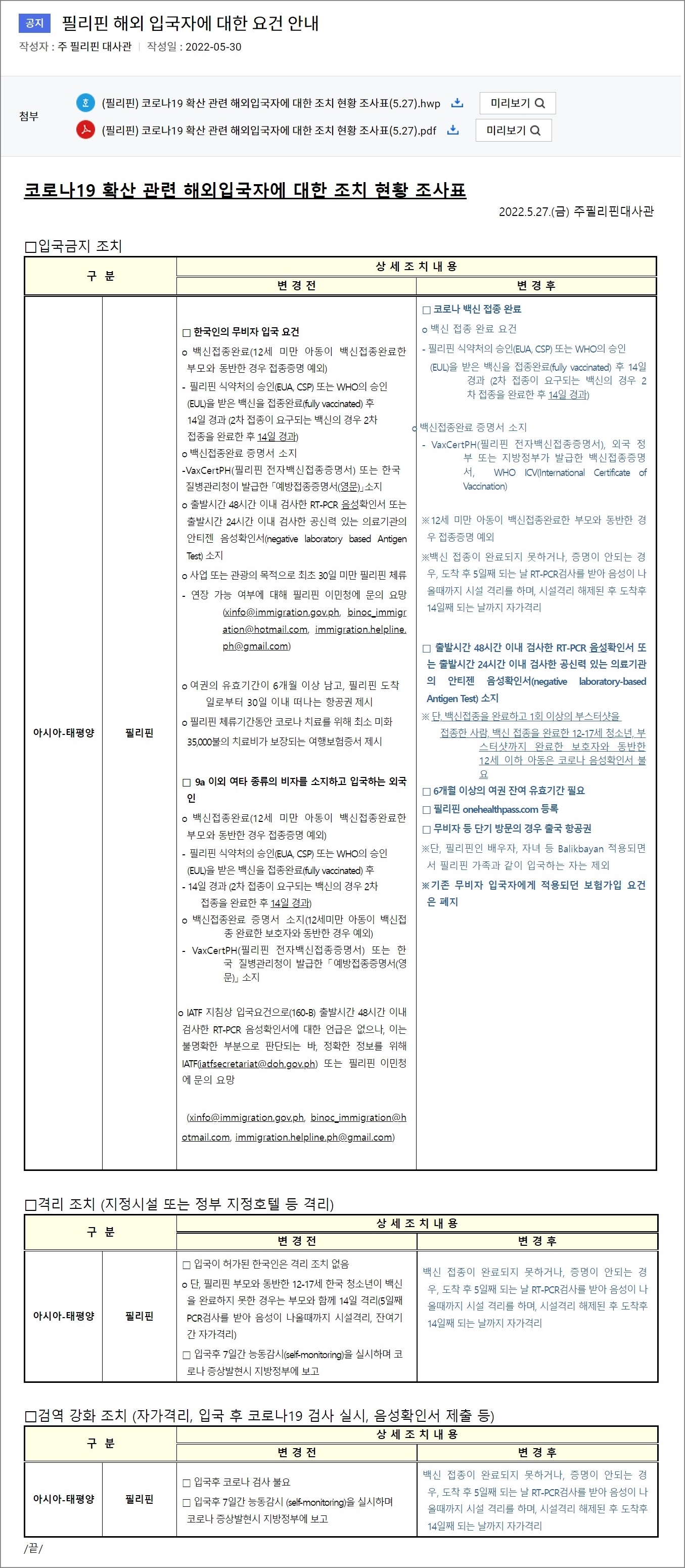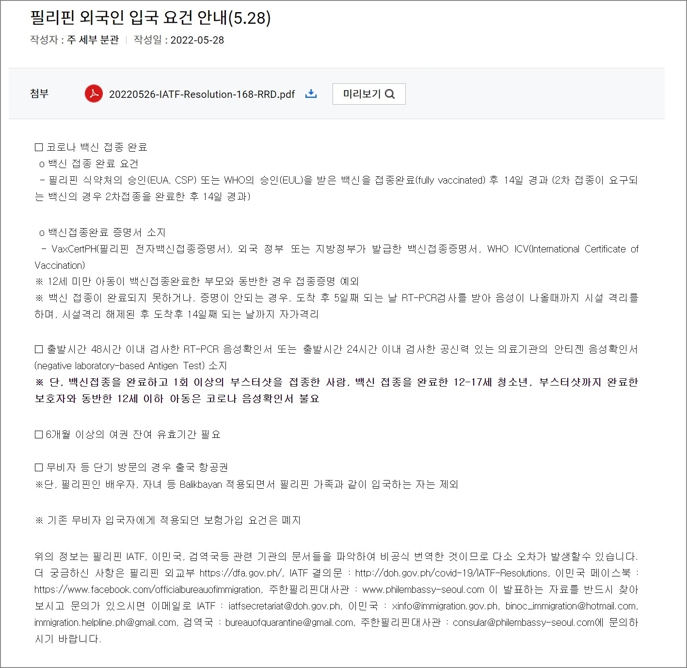 · 주필리핀 대한민국 대사관 : 필리핀 해외 입국자에 대한 요건 안내