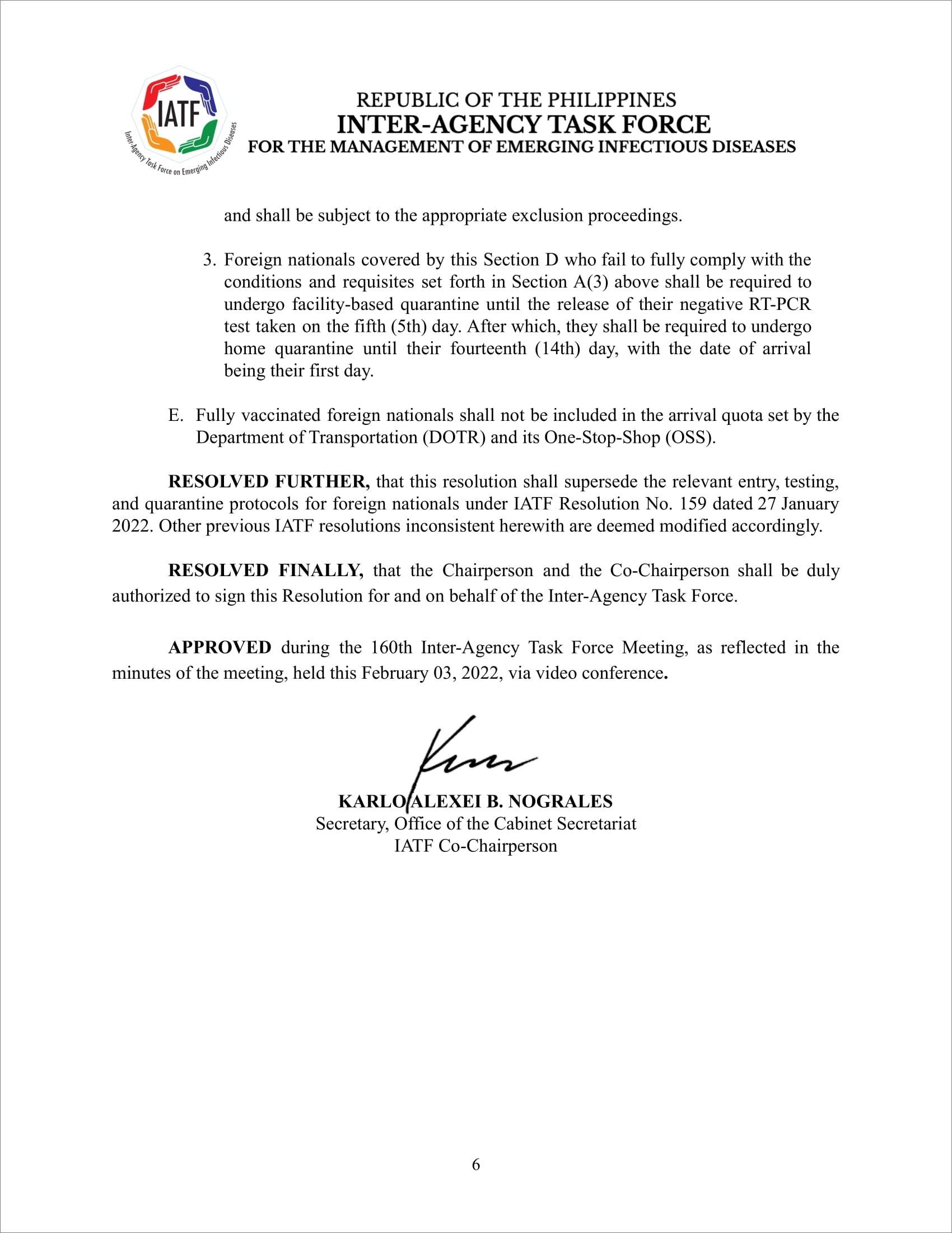 2022년 2월 4일 발표된 IATF 결의안(RESOLUTION NO. 160-B)에 따라 2월 10일부터 ▲무비자 입국이 허용되는 157개국의 국민이 ▲코로나19 예방접종을 완료하고 ▲RT-PCR 음성확인서 ▲왕복항공권 ▲해외여행보험 등의 준비물을 갖추는 경우 필리핀 입국이 허용된다.
