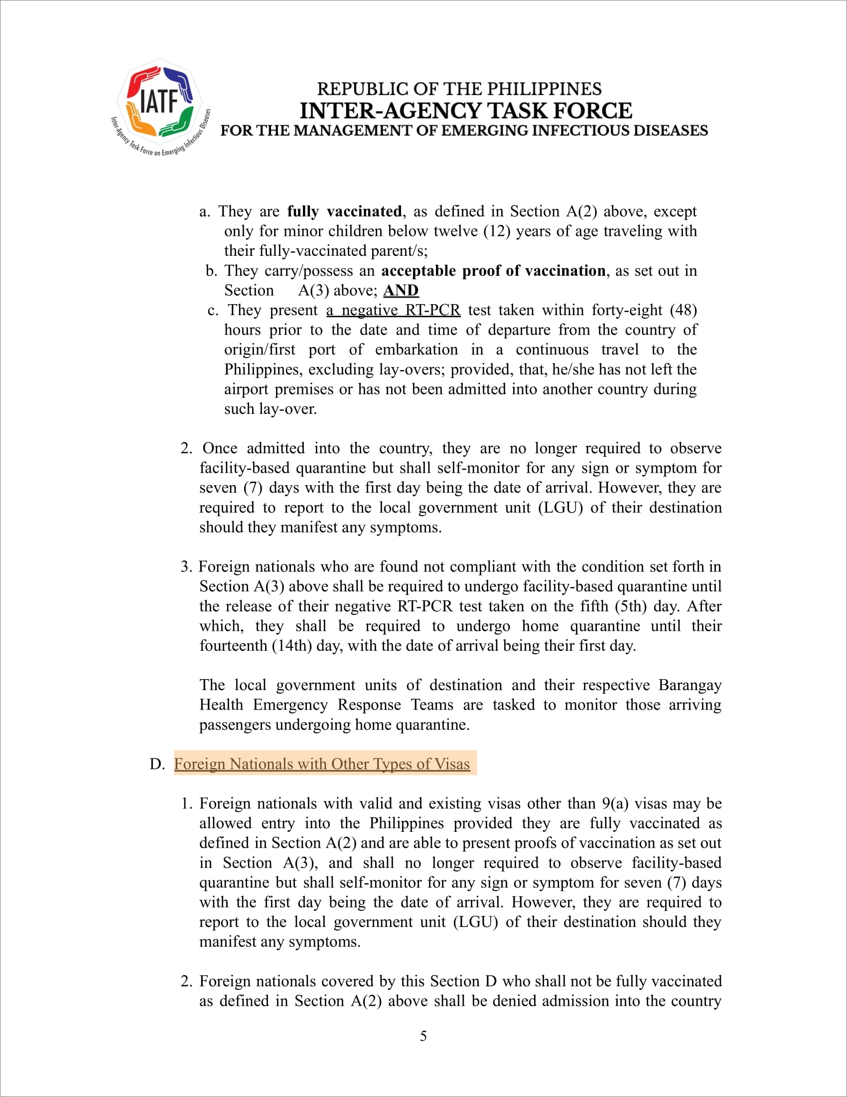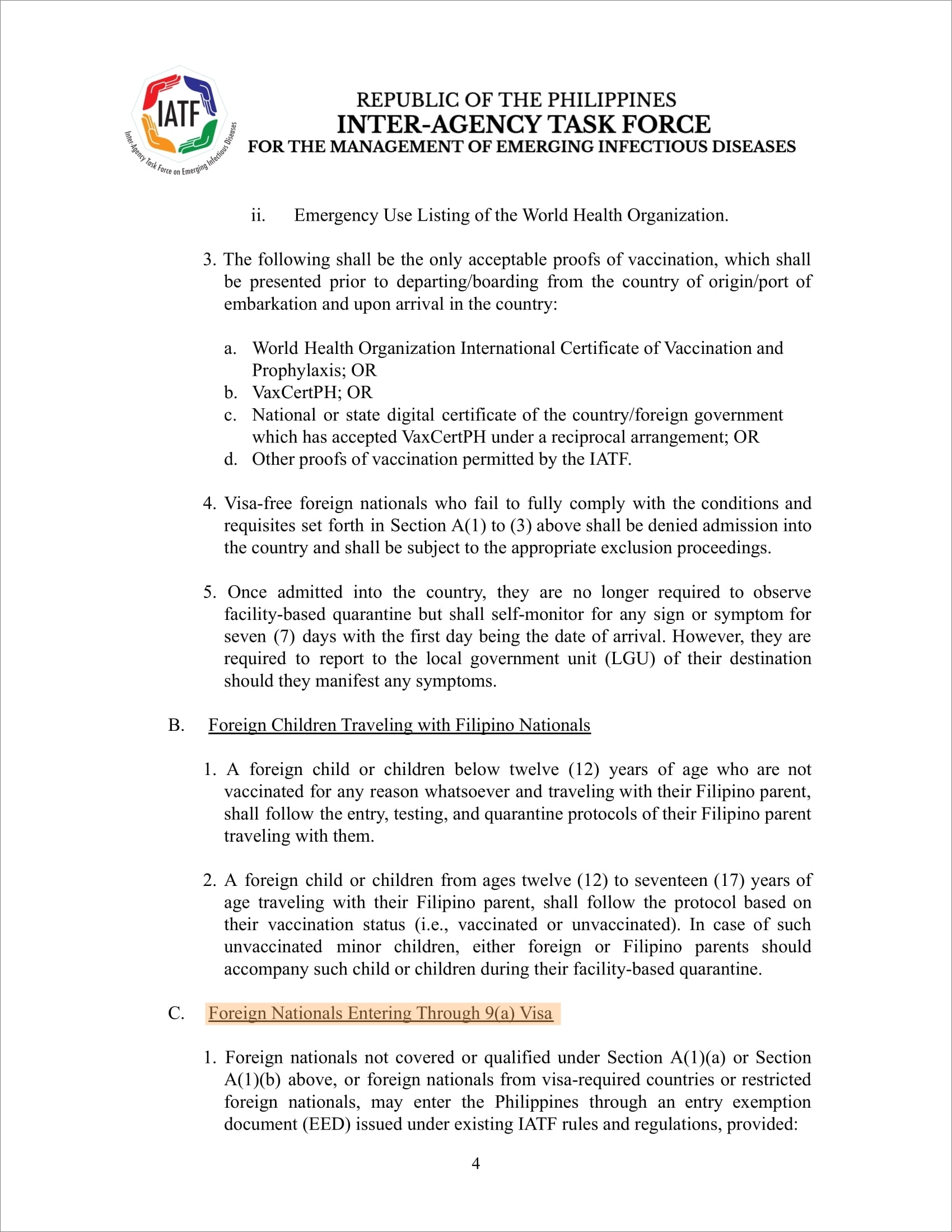 1. 입국시점에 유효한 비자를 가지고 있는 외국인은 Section A에 정의된 백신 접종을 완료하고 예방접종증명서를 제시할 수 있는 경우 필리핀 입국이 허용됨