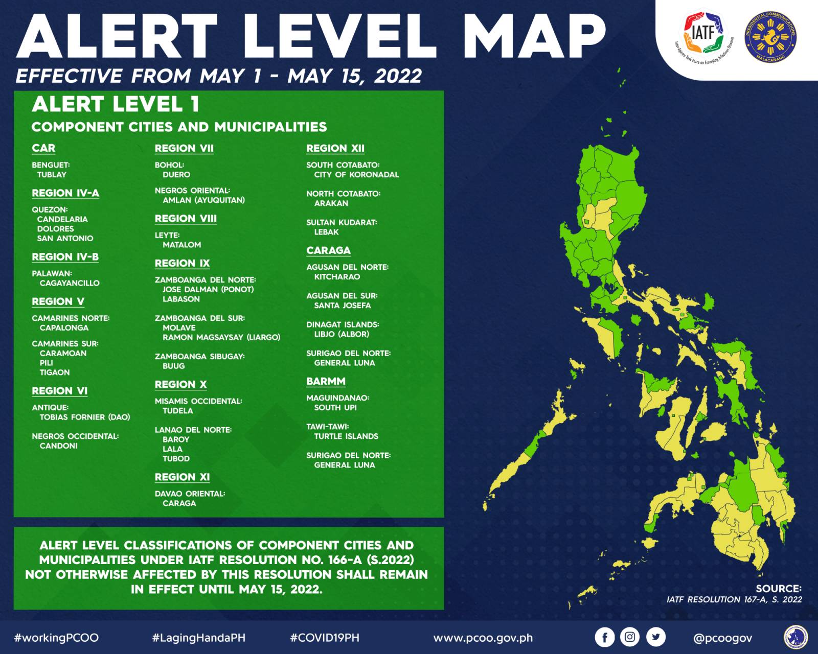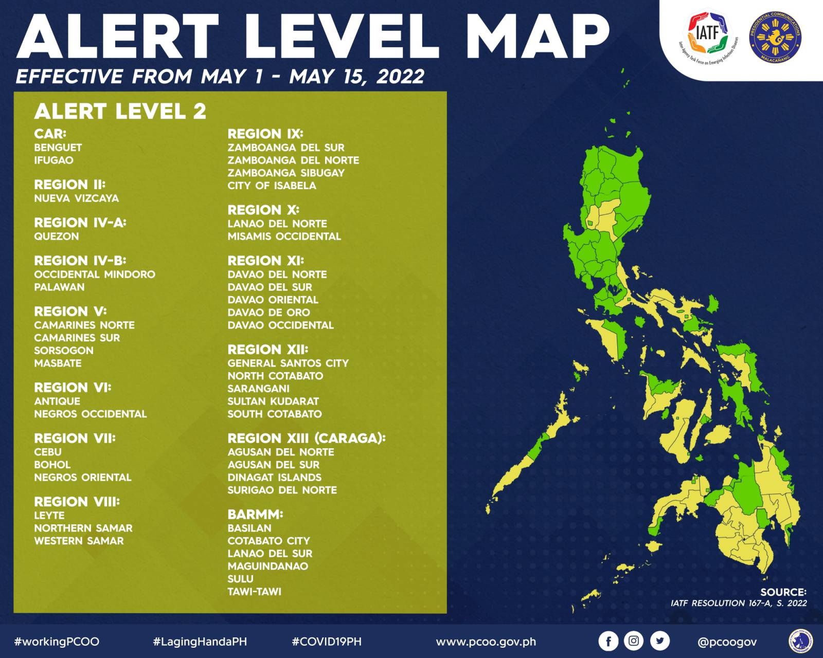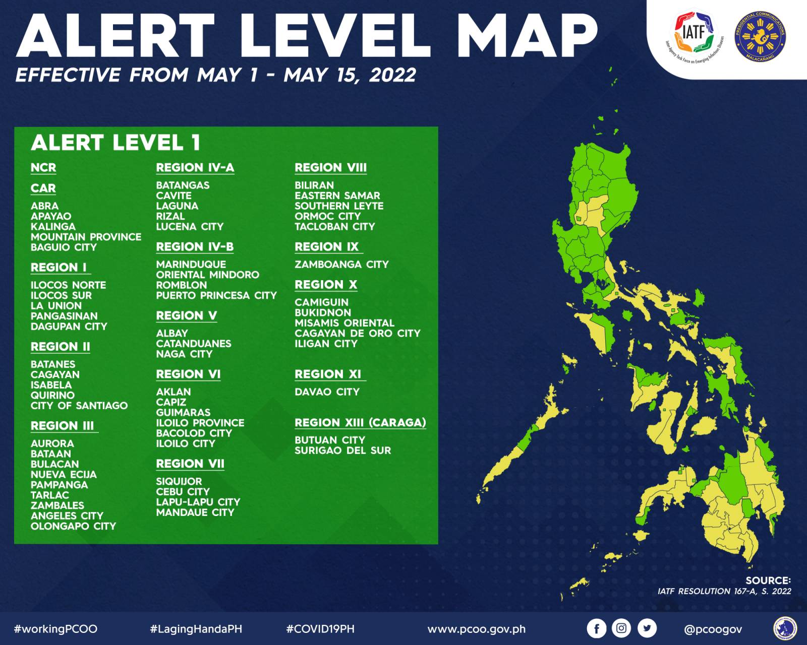 2022년 5월 1일부터 5월 15일까지 필리핀 각 지역의 경보단계시스템(COVID-19 Alert Level System)은 아래와 같이 적용된다. 메트로 마닐라를 비롯하여 바탕가스, 세부 등의 지역은 경고단계 1단계(Alert Level 1)의 적용을 받는다. 경고단계 3단계(Alert Level 3)와 경고단계 4단계(Alert Level 4)는 대상 지역이 없다.