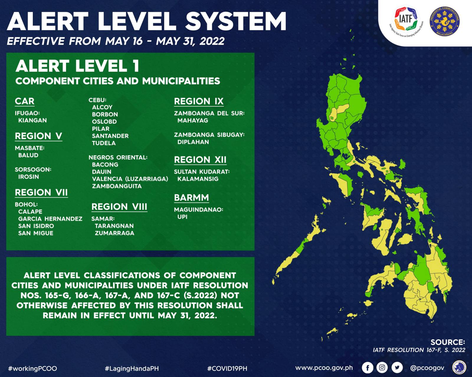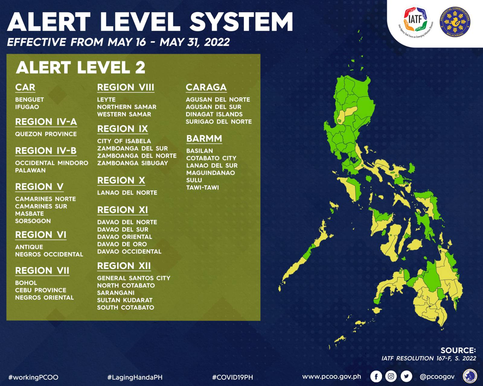 2022년 5월 16일부터 5월 31일까지 필리핀 각 지역의 경보단계시스템(COVID-19 Alert Level System)은 아래와 같이 적용된다.