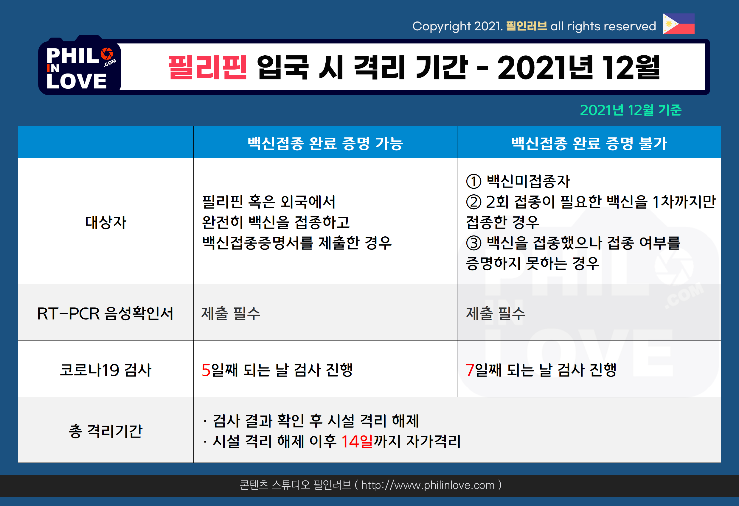 새로 강화된 격리 규정에 따르면 앞으로 코로나19 접종 여부와 상관없이 모든 필리핀 입국자들은 출발 기준 72시간 이내 코로나 검사를 받고 RT-PCR 음성결과서를 제출해야만 한다. 백신 예방접종완료자도 코로나19 음성확인서를 제출해야 하며, 입국일로부터 14일까지 자가격리(home quarantine)를 하게 된다. 음성확인서가 없는 경우 항공편 탑승이 제한된다.