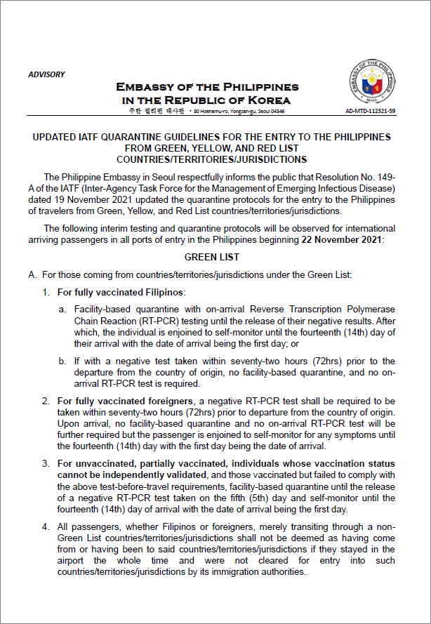 새로 강화된 격리 규정에 따르면 앞으로 코로나19 접종 여부와 상관없이 모든 필리핀 입국자들은 출발 기준 72시간 이내 코로나 검사를 받고 RT-PCR 음성결과서를 제출해야만 한다. 백신 예방접종완료자도 코로나19 음성확인서를 제출해야 하며, 입국일로부터 14일까지 자가격리(home quarantine)를 하게 된다. 음성확인서가 없는 경우 항공편 탑승이 제한된다.