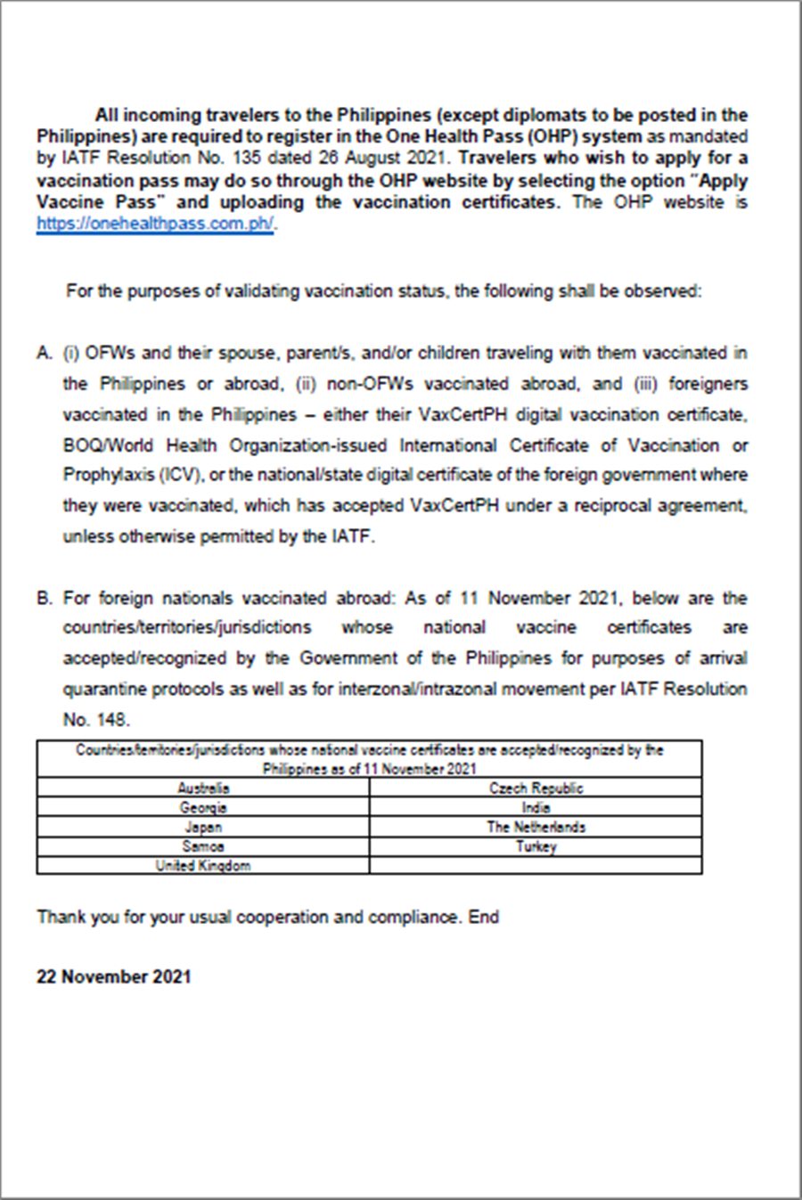 - 관련 글 보기 : [필리핀 입국] IATF가 승인한 백신접종증명서 인정 국가 목록(한국 불포함)