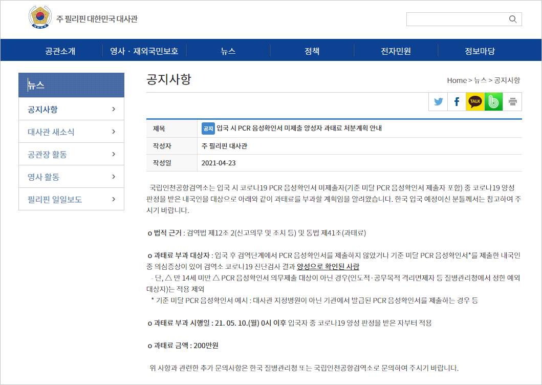 · 주 필리핀 대한민국 대사관 : 입국 시 PCR 음성확인서 미제출 양성자 과태료 처분계획 안내