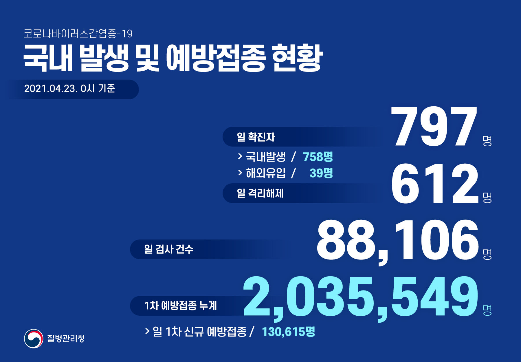 · 대한민국 질병관리청 : 코로나바이러스감염증-19 국내 발생 및 예방접종 현황(4.23. 0시 기준)