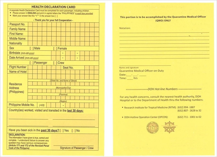 2021년 2월 현재 필리핀 정부에서는 필리핀에 입국한 외국인에 대해 공항에서 코로나19 검사 비용을 지불한 뒤 격리호텔로 이동하도록 하고 있다. 필리핀 검역국(BOQ-Bureau of Quarantine) 규정에 따라 코로나19 음성확인서를 발급받을 때까지 격리호텔(격리시설)에 머물러야 하는데 이 과정만 대략 7일 정도 소요된다. 코로나19 검사를 위해 호텔 격리 6일째 되는 날 의료진이 격리호텔에 방문하여 검사를 진행하게 된다. 보통 다음 날(7일 차)에 코로나18 검사확인서를 받게 되며, 검사 결과가 음성으로 나왔다면(코로나19 감염 증상이 없다면) 코로나19 음성확인서와 BOQ 격리 해지 통보서를 받은 뒤 거주지로 이동할 수 있다.