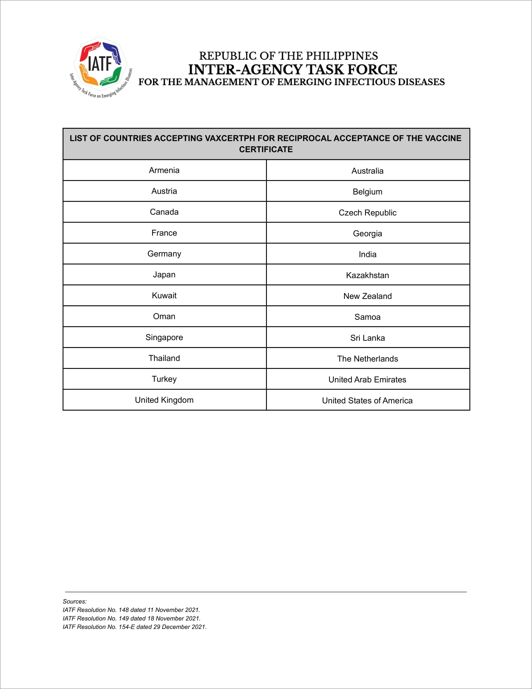 지난 2021년 12월 30일 필리핀 IATF에서 발표한 결의안(IATF RESOLUTION NO. 154-E)에 따르면, 미국과 영국, 프랑스 등 24개 국가에 대해 예방접종증명서에 대해 사용을 승인한다고 한다. 하지만 한국은 여전히 이 목록에 포함되지 않는다. 즉, 대한민국 질병관리청에서 발급한 영문 예방접종증명서나 쿠브(COOV) 모두 필리핀 정부에서 인정하는 코로나19 예방접종증명서로 분류되지는 못한다. 아쉬운 일이지만, 이는 필리핀 정부와 한국 정부 사이에서 예방접종증명서 상호 인정을 위한 협의가 필요한 부분이라 한국이 백신접종증명서 인정 국가가 되기까지는 다소 시간이 소요될 것으로 예상된다.