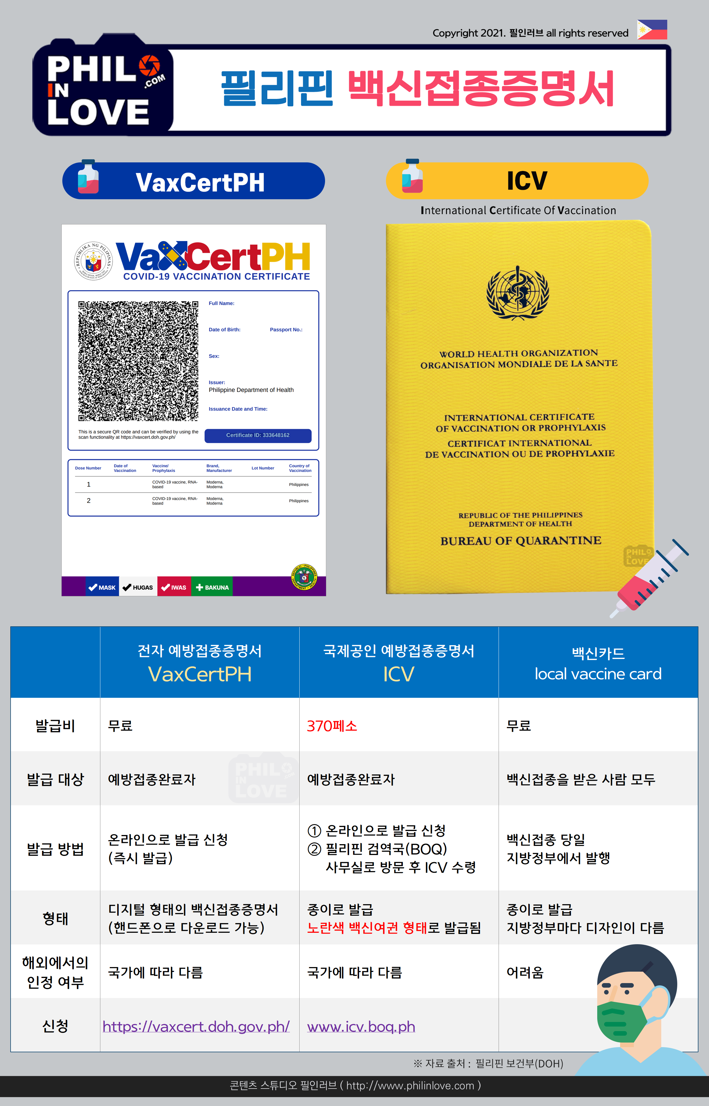 2022년 1월 현재 필리핀 입국 시 코로나19 백신 예방 접종 상태를 확인하기 위해 이용할 수 있는 증명서는 아래와 같다.