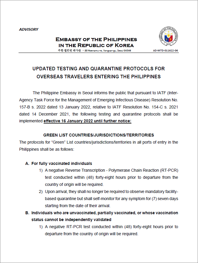 | [필리핀 입국] 2월부터 적용되는 호텔 격리 규정 (백신접종자는 시설 격리 면제) (0) | 2022.01.28 |