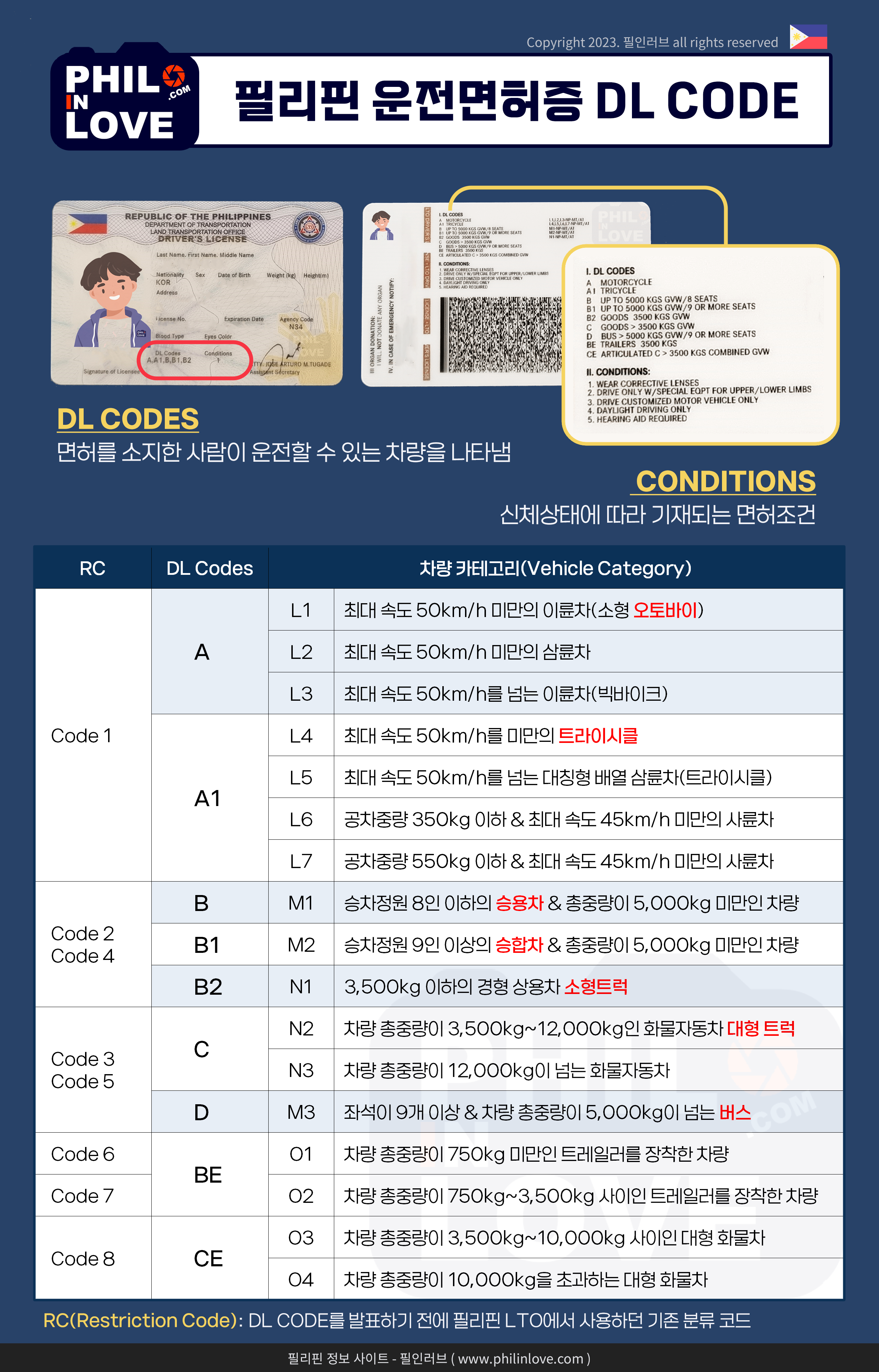 - RC(Restriction Code): DL CODE를 발표하기 전에 필리핀 LTO에서 사용하던 기존 분류 코드