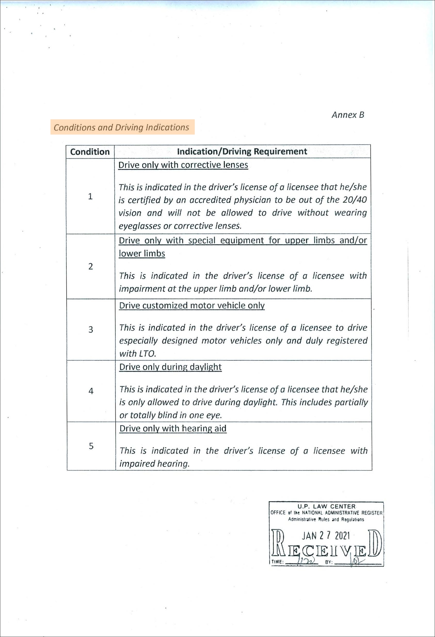 | Condition Code 3 | 신체장애 정도에 적합하게 특수설계된 차로 LTO의 승인을 받는 자동차만 운전 가능 |