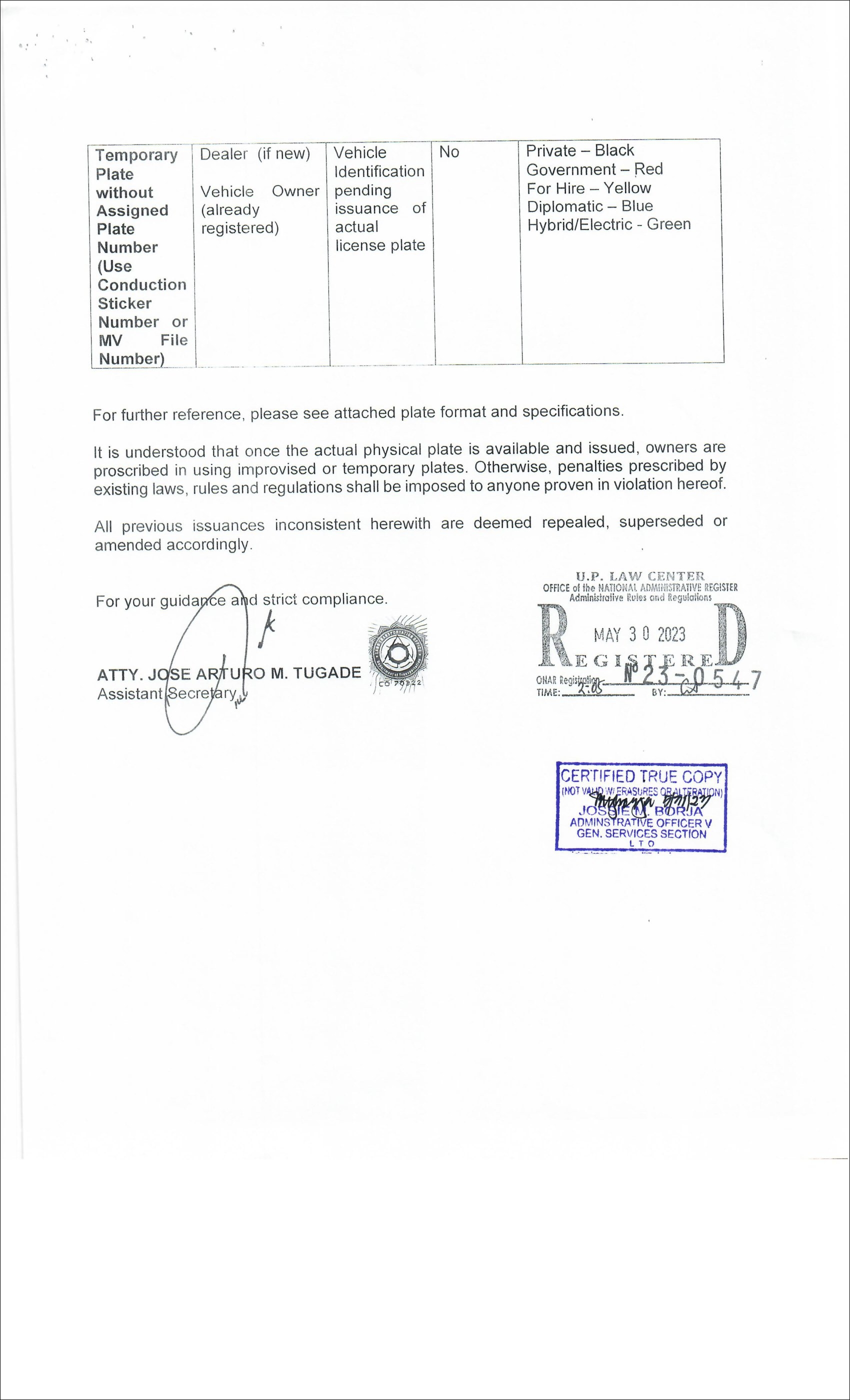 자동차나 오토바이를 구매한 뒤 OR과 CR까지 모두 발급받았음에도 불구하고 자동차 등록번호판을 받기까지의 시간이 무기한 소요되는 상황이 계속되자 LTO에서는 2023년 5월 임시번호판 사용과 관련된 규정(LTO Memorandum Circular JMT-2023-2400)을 발표하기에 나섰다. 이 메모랜덤에 따르면, 공식 번호판이 발급될 때까지 차량 임시번호판 사용이 합법적으로 허용된다. 임시번호판은 자량 소유주가 직접 제작하여 사용할 수 있으며, LTO로부터 임시번호판 사용에 대한 신청을 할 필요도 없다. 하지만 차종이나 차량 등록 상태 등에 따라 임시번호판 제작 형식이 지정되어 있다. 예를 들어 번호판 좌우에는 지역과 딜러명이, 상단과 하단에는 등록됨(Registered)과 임시번호판(Temporary Plate)이란 단어가 인쇄되어야 하는 식이다. 한편, 번호판이 도난이나 분실, 손상된 경우는 템퍼레리 플레이트(Temporary plates)가 아닌 임프로바이즈 플레이트(improvised plates)를 사용하게 된다. 임프로바이즈 플레이트를 사용하기 위해서는 LTO로부터 사용 승인이 필요하다.