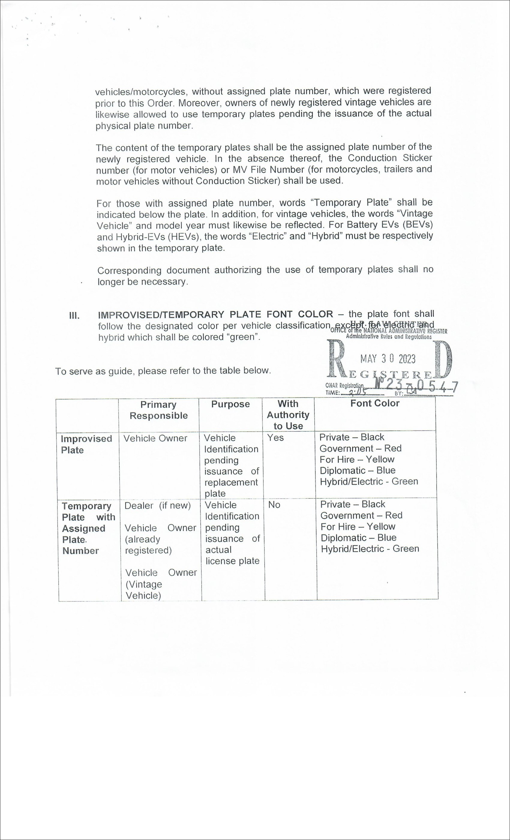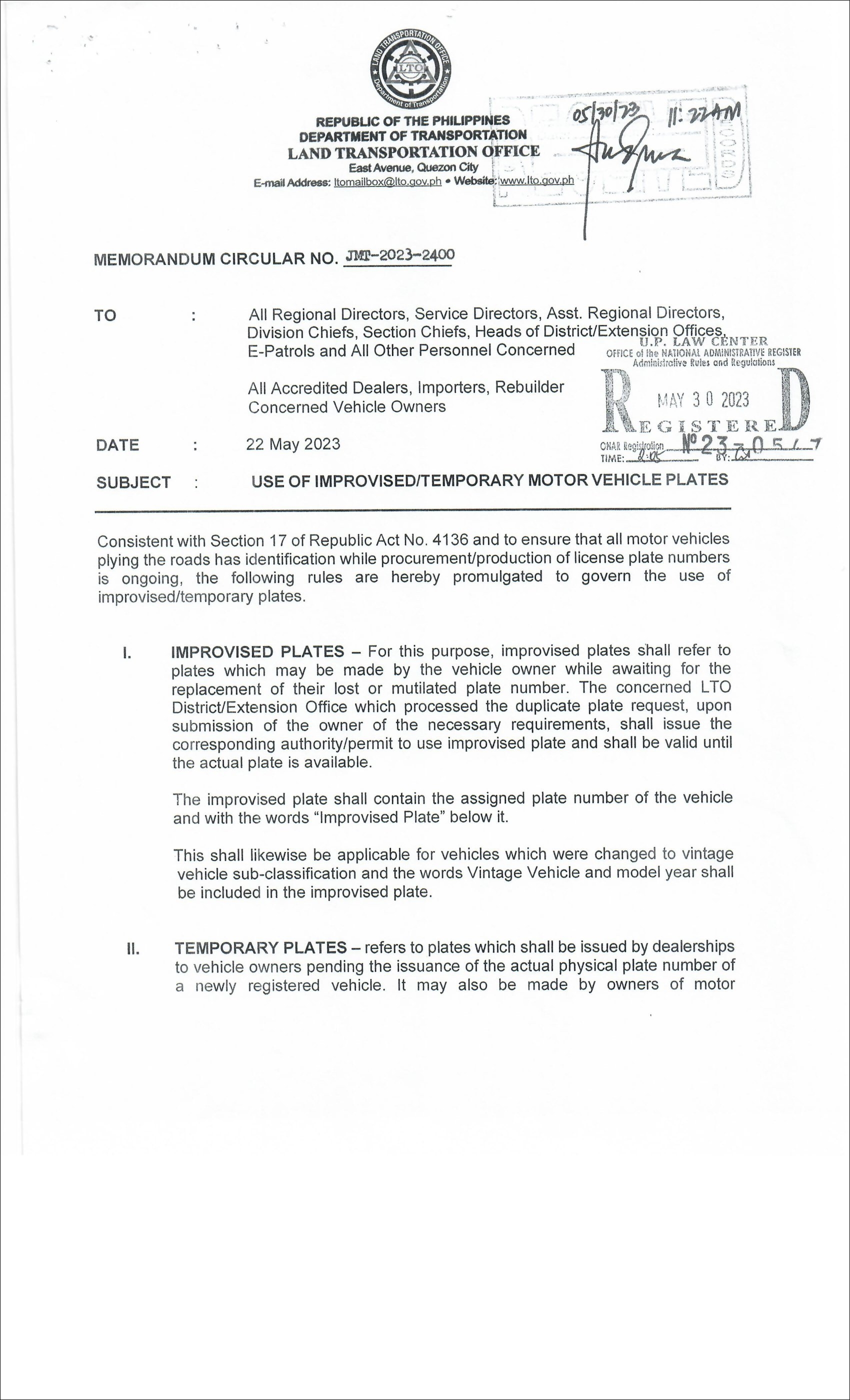 자동차나 오토바이를 구매한 뒤 OR과 CR까지 모두 발급받았음에도 불구하고 자동차 등록번호판을 받기까지의 시간이 무기한 소요되는 상황이 계속되자 LTO에서는 2023년 5월 임시번호판 사용과 관련된 규정(LTO Memorandum Circular JMT-2023-2400)을 발표하기에 나섰다. 이 메모랜덤에 따르면, 공식 번호판이 발급될 때까지 차량 임시번호판 사용이 합법적으로 허용된다. 임시번호판은 자량 소유주가 직접 제작하여 사용할 수 있으며, LTO로부터 임시번호판 사용에 대한 신청을 할 필요도 없다. 하지만 차종이나 차량 등록 상태 등에 따라 임시번호판 제작 형식이 지정되어 있다. 예를 들어 번호판 좌우에는 지역과 딜러명이, 상단과 하단에는 등록됨(Registered)과 임시번호판(Temporary Plate)이란 단어가 인쇄되어야 하는 식이다. 한편, 번호판이 도난이나 분실, 손상된 경우는 템퍼레리 플레이트(Temporary plates)가 아닌 임프로바이즈 플레이트(improvised plates)를 사용하게 된다. 임프로바이즈 플레이트를 사용하기 위해서는 LTO로부터 사용 승인이 필요하다.