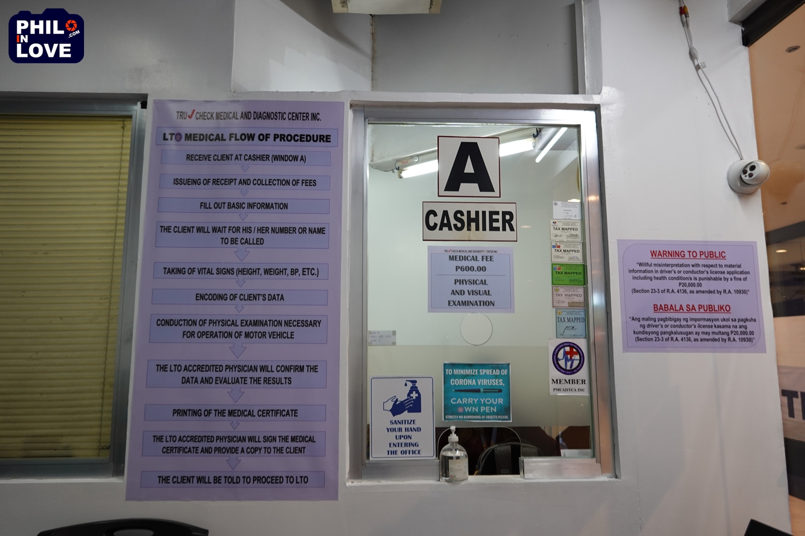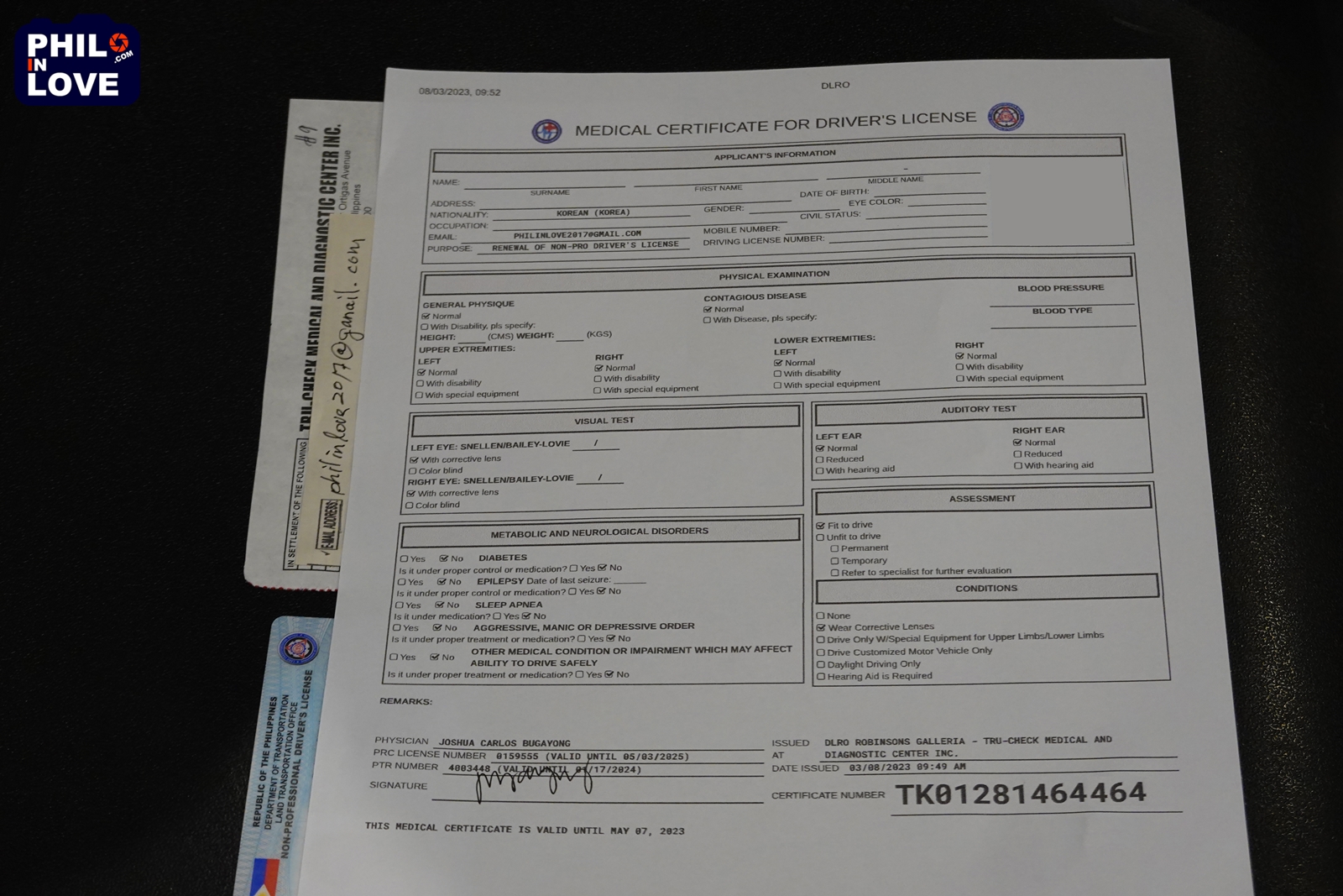 LTO에서 지정한 클리닉(LTO-accredited clinic)에 방문하여 간단한 신체검사(건강검진) 후 건강증명서(Mediacal Certificate)를 발급받아야 한다. 클리닉은 LTO 사무소 근처에서 쉽게 찾을 수 있으며, 검사는 혈압 검사 등 간단한 신체검사로 진행된다. 소변검사는 하지 않는다.