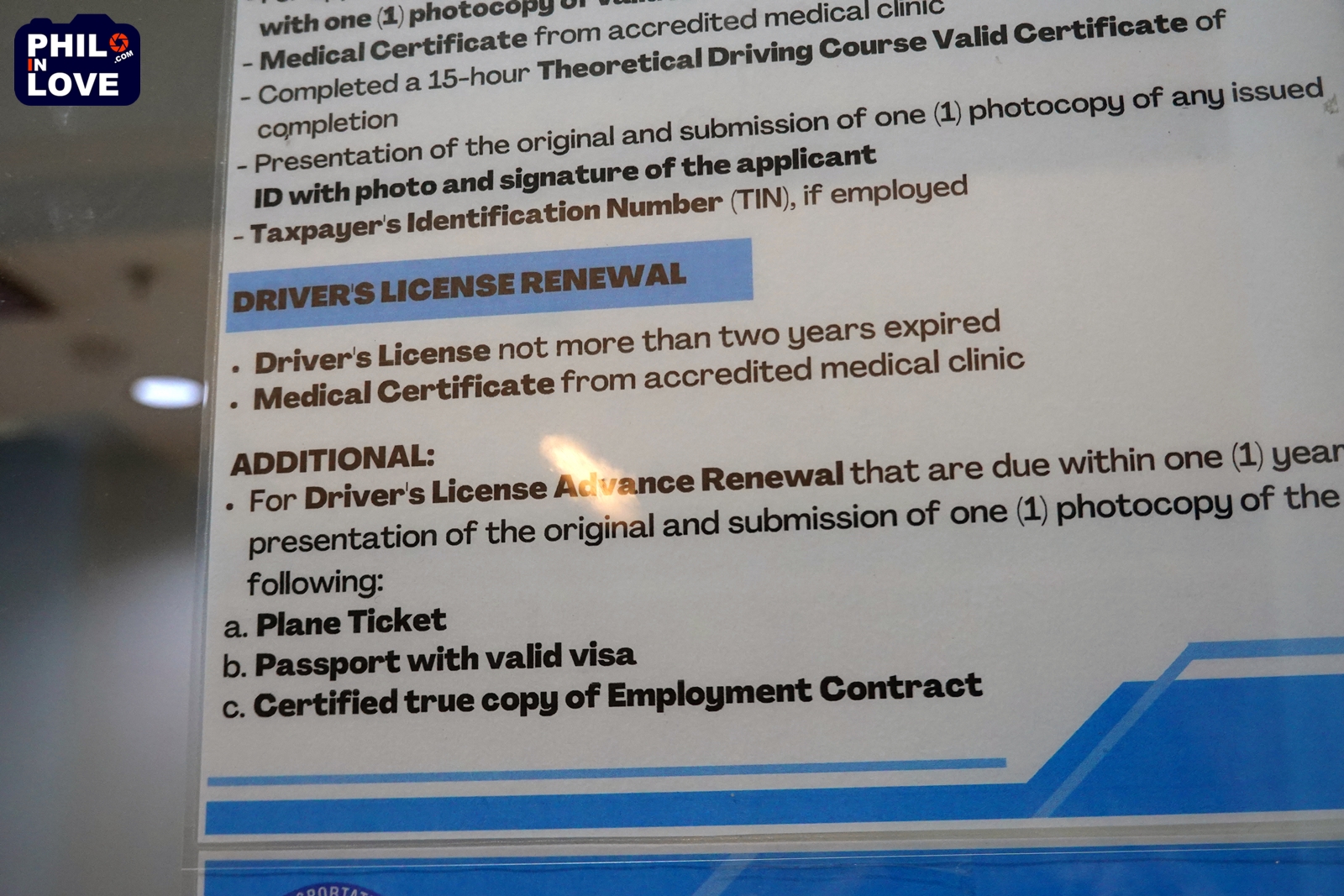 2023년 현재 필리핀 교통국(LTO)에서는 운전면허증을 갱신(리뉴얼)하고자 하는 운전자에게 LTO의 온라인 시스템(LTMS)에 등록 후 간단한 필기시험(OVE)을 치르도록 하고 있다. LTO에 방문하여 ▲기존 운전면허증 카드 ▲필기시험 응시 후 발급되는 인증서(Certificate) ▲건강증명서를 제출하면 운전면허증 갱신 신청이 가능하다. 10년 동안 무사고 운전을 했다면 유효기간이 10년인 운전면허증으로 갱신할 수 있다.