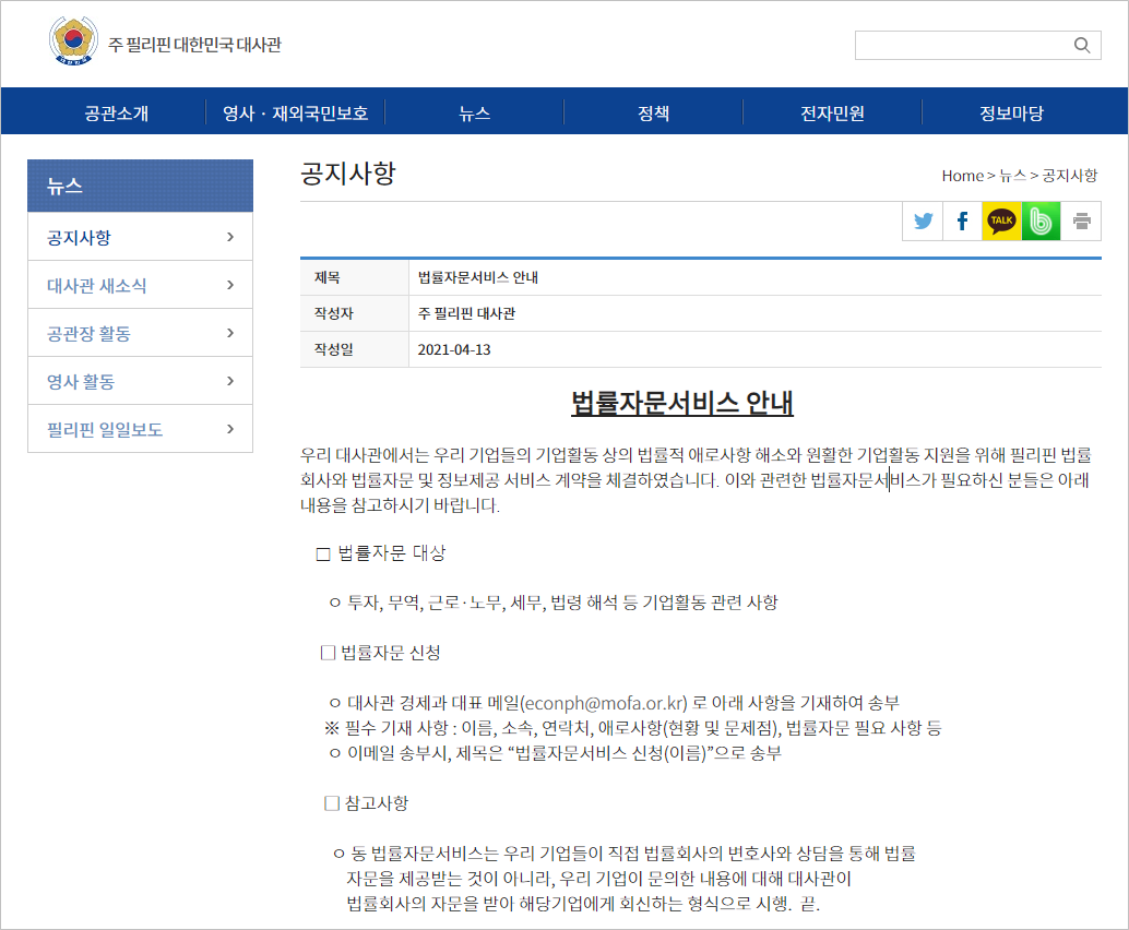 [주 필리핀 대한민국 대사관] 기업을 위한 법률자문서비스 시작