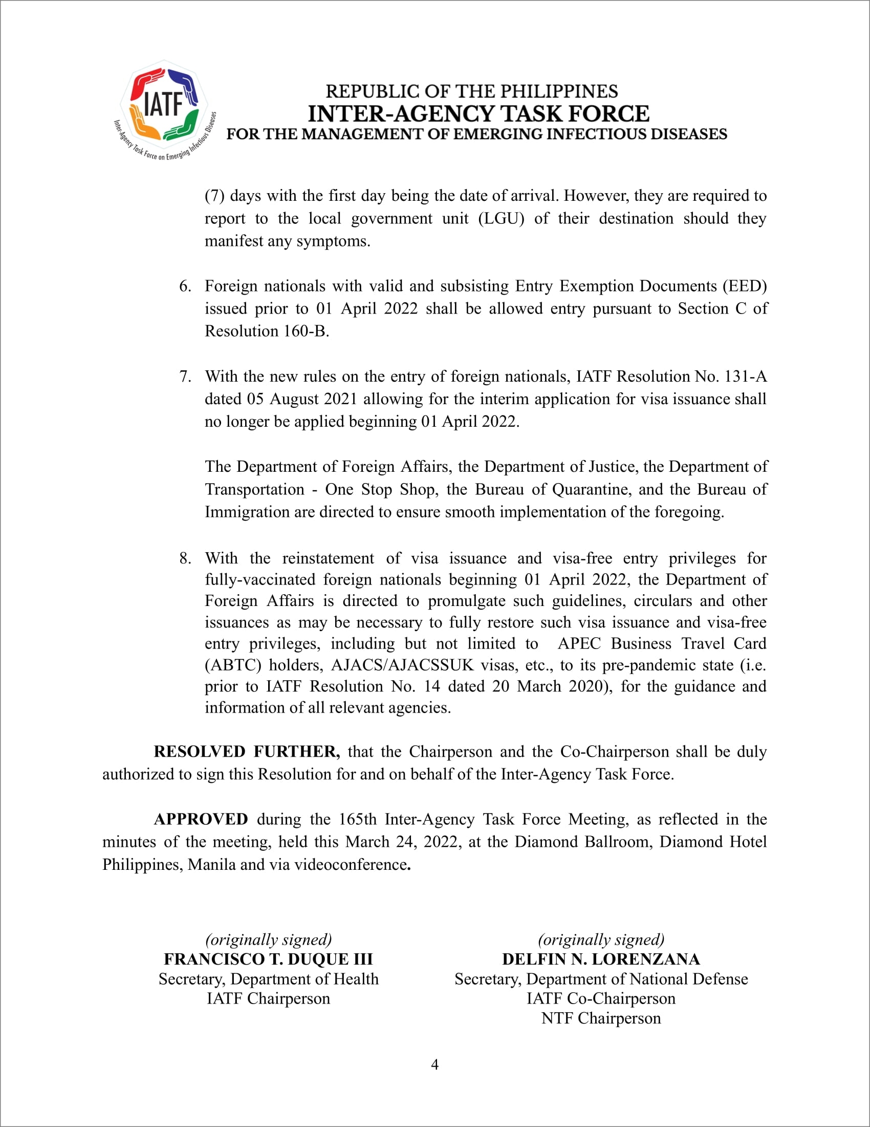 2022년 4월 1일 이전에 제출된 비자신청서는 기존 규정인 IATF Resolution No.131-A에 따라 처리된다.