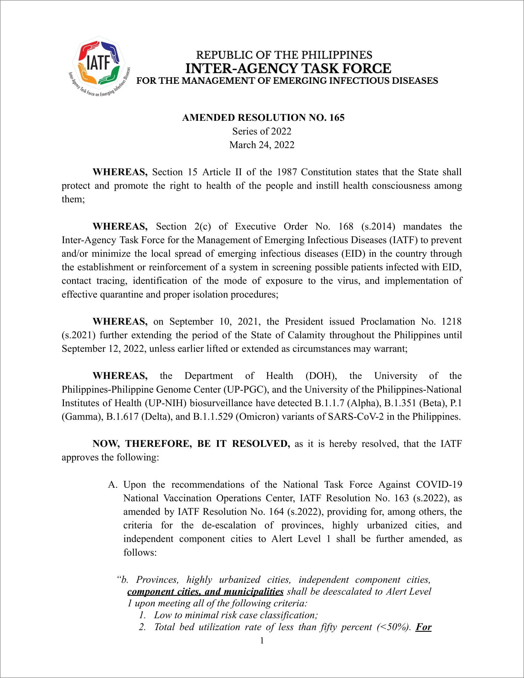 최근 발표된 IATF 결의안 165호(Resolution No. 165). 이 규정에 따라 주한필리핀대사관을 통해 9(A) 비자를 신청하는 경우 필리핀 외교부의 입국승인서를 준비하지 않아도 된다.