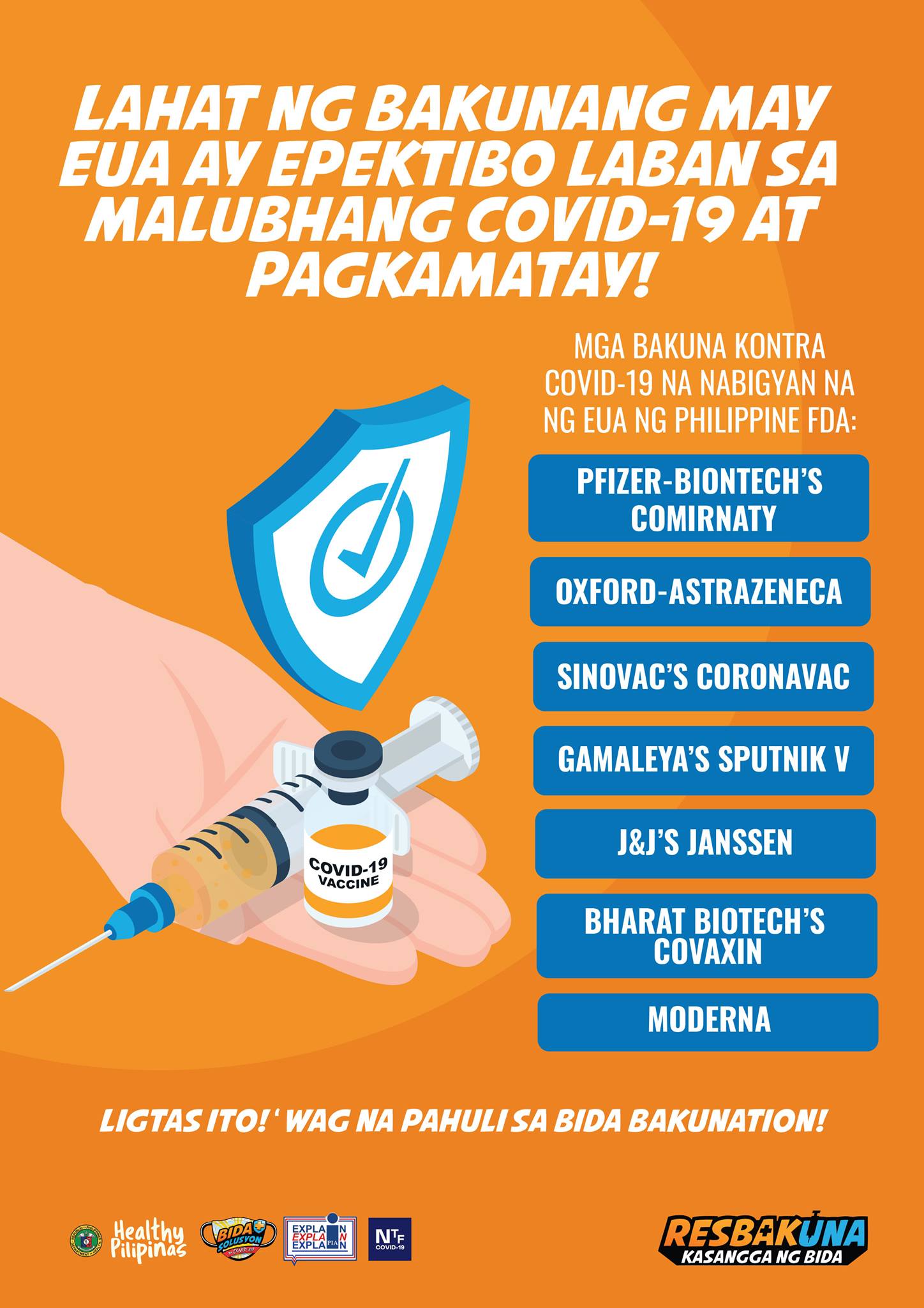 2021년 6월 현재까지 필리핀 FDA(Food and Drug Administration)에서는 총 8개의 백신에 대해 사용을 승인했다. 즉, 필리핀에서는 여덟 가지 종류의 코로나19 백신이 사용 가능하다.