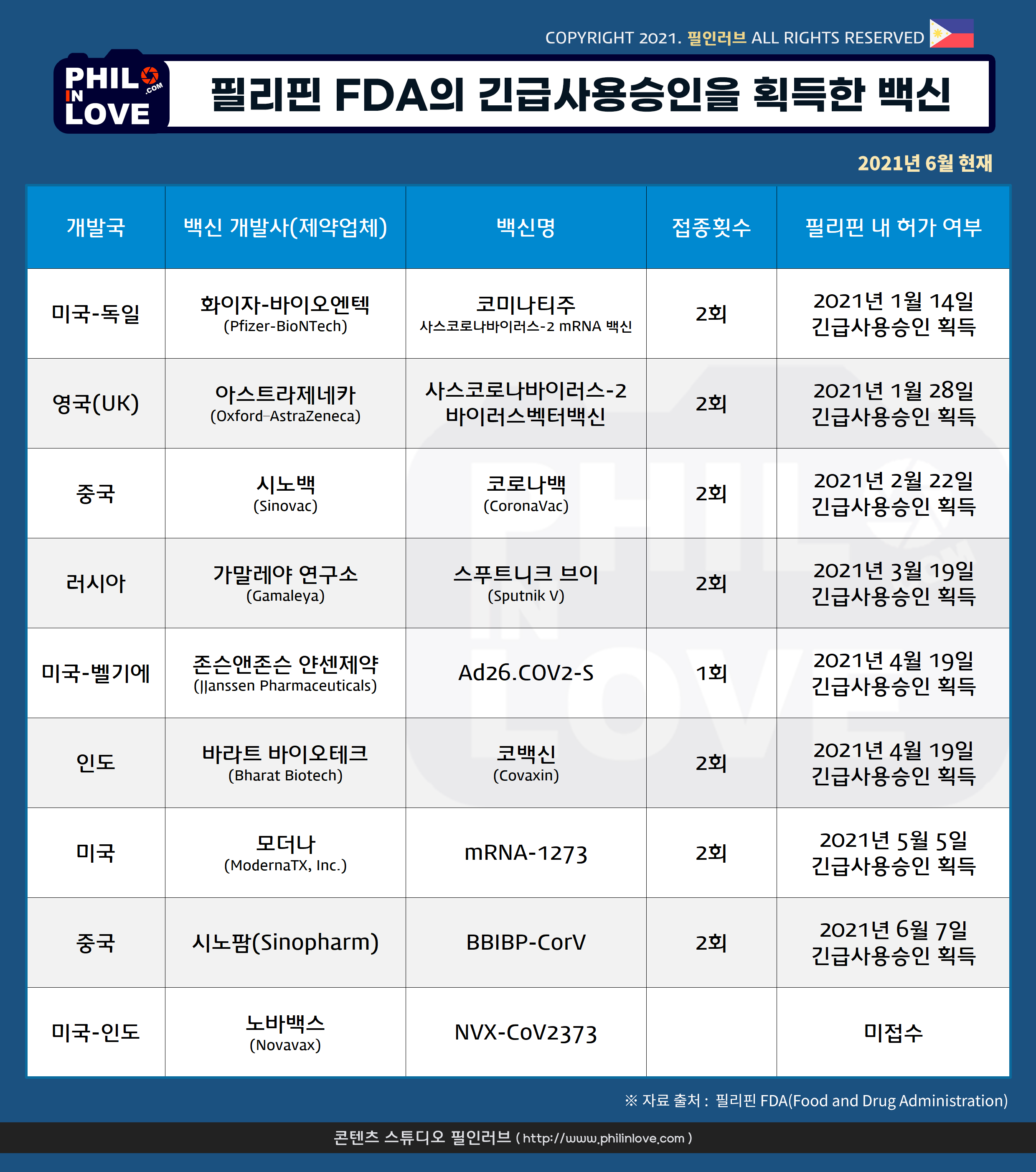 + 관련 글 보기 : [코로나19 백신] 필리핀에서 사용 가능한 백신은? (FDA의 긴급사용승인 획득)