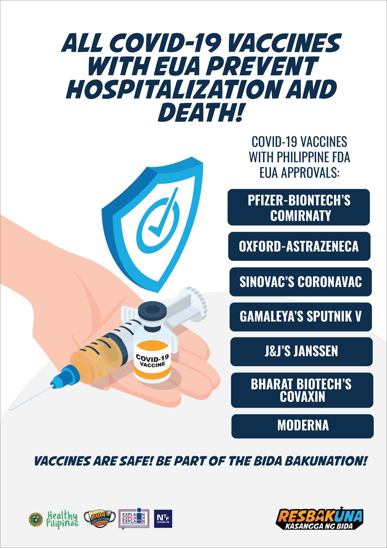 2021년 6월 현재까지 필리핀 FDA(Food and Drug Administration)에서는 총 8개의 백신에 대해 사용을 승인했다. 즉, 필리핀에서는 여덟 가지 종류의 코로나19 백신이 사용 가능하다.